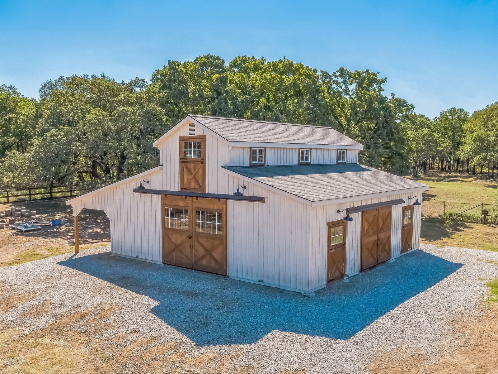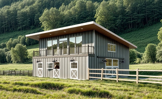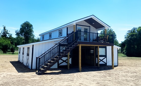 Live with your horses under one roof. Modern styles offer an upstairs residence with spray‑foam insulation, sound isolation, energy‑efficient windows, and separate exterior access to help reduce lower-level barn noise and dust.