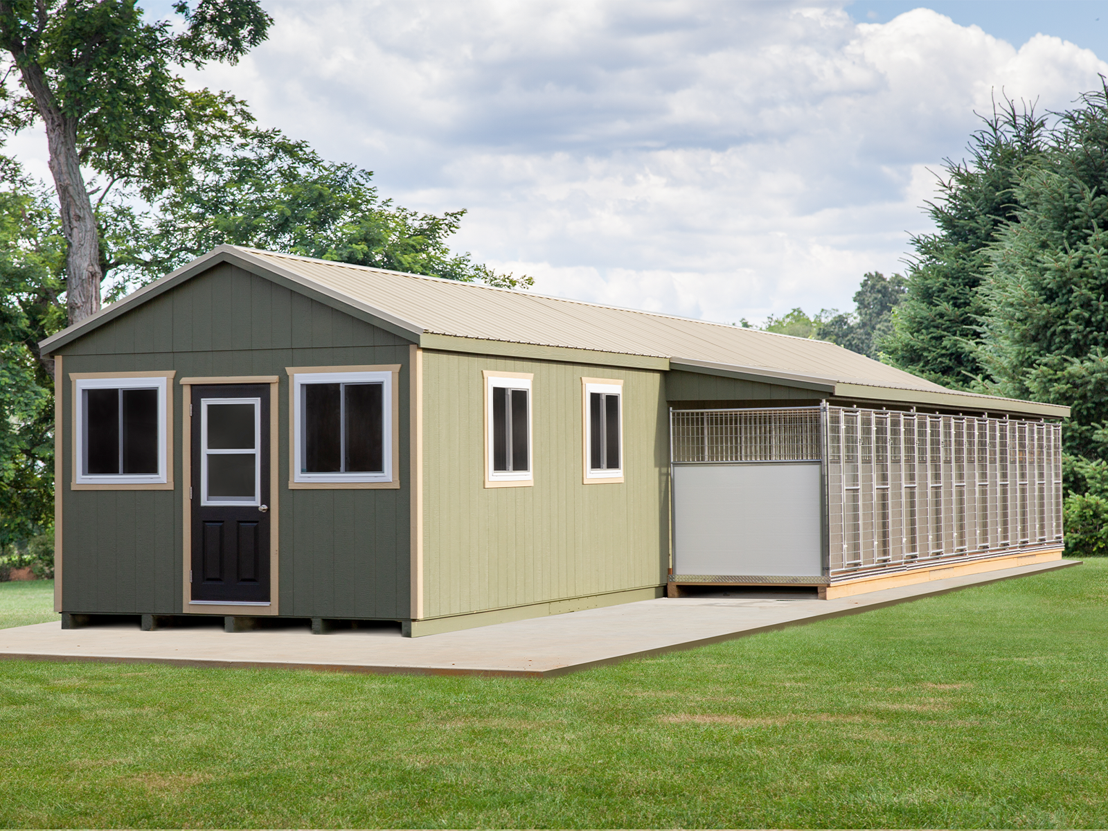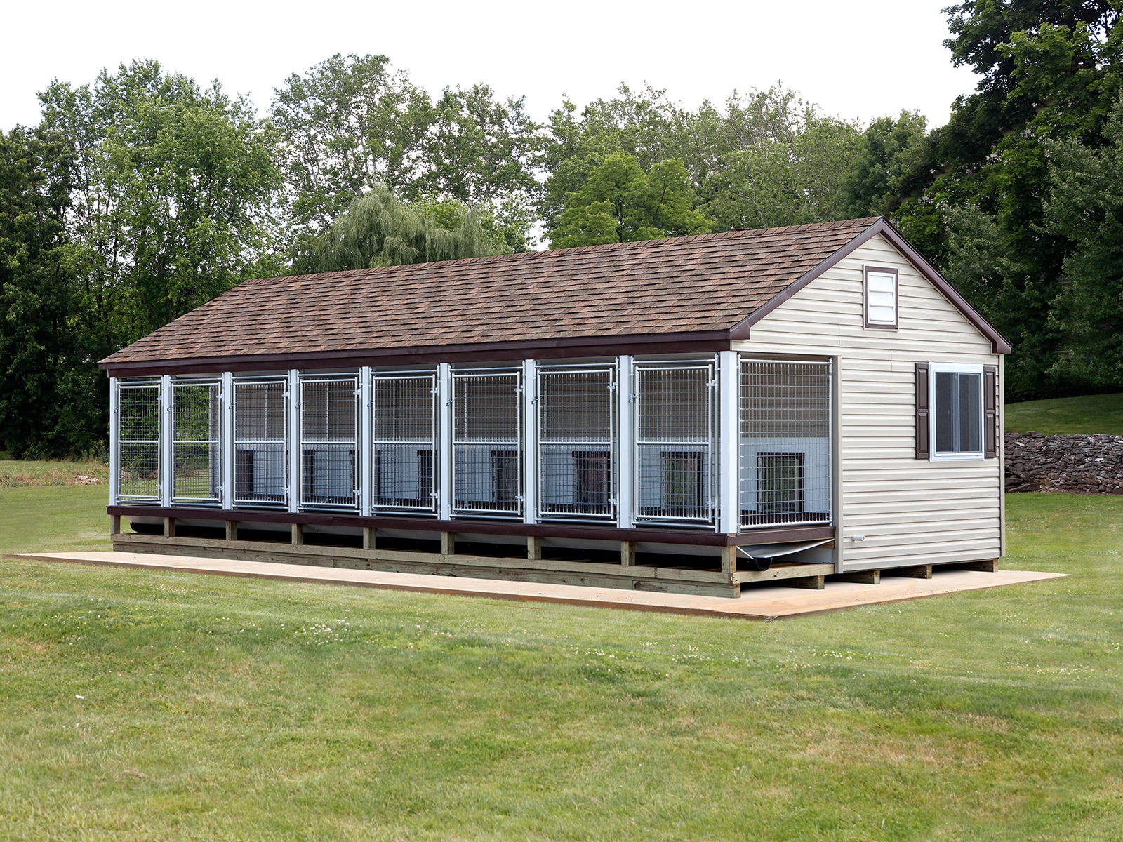 We love this large, sturdy dog kennel for breeders, rescues, and hunting dogs as it offers plenty of space for five dogs, with designated indoor and outdoor areas. There is also an 8’x10’ lobby area where you can store food and equipment, place a utility sink, and more.