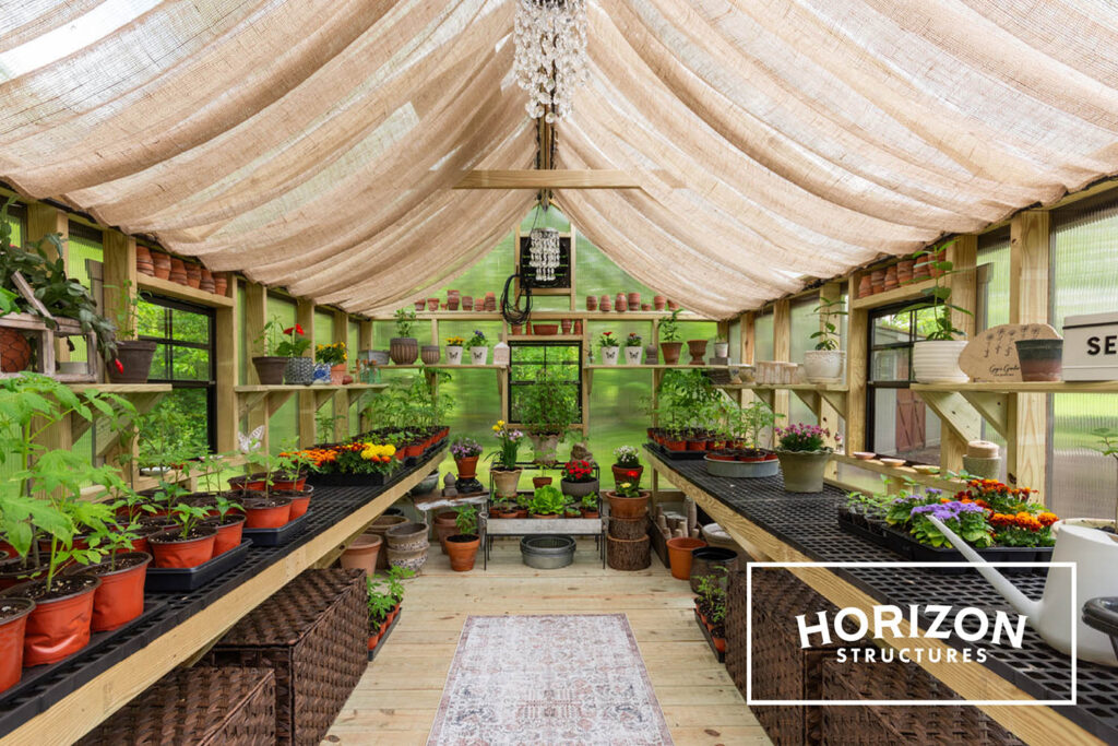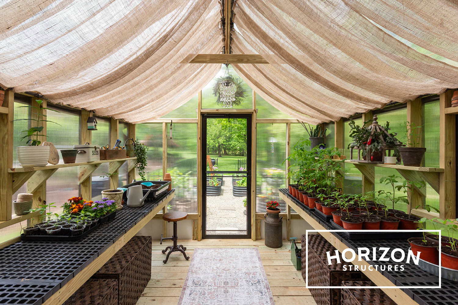 Inside, you’ve got full length potting benches on both sides, heavy duty shelving, and plenty of room to move around and work. The rafters support the shade cloth system, letting you control heat and light as the seasons change. It’s built on a simple gravel base for drainage, keeping the structure dry and stable year round.