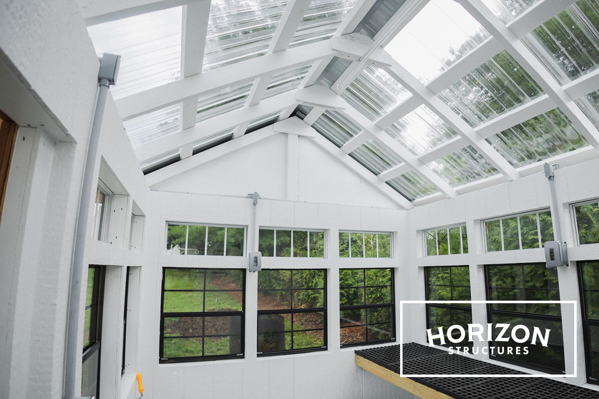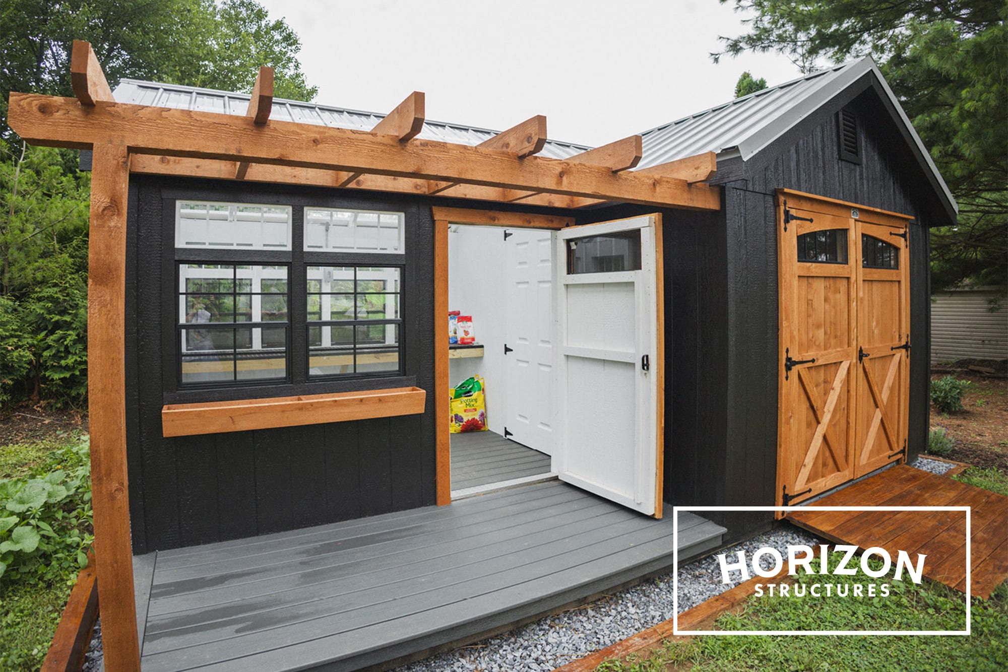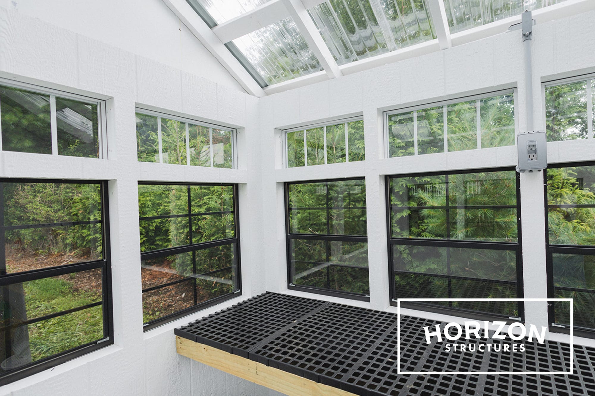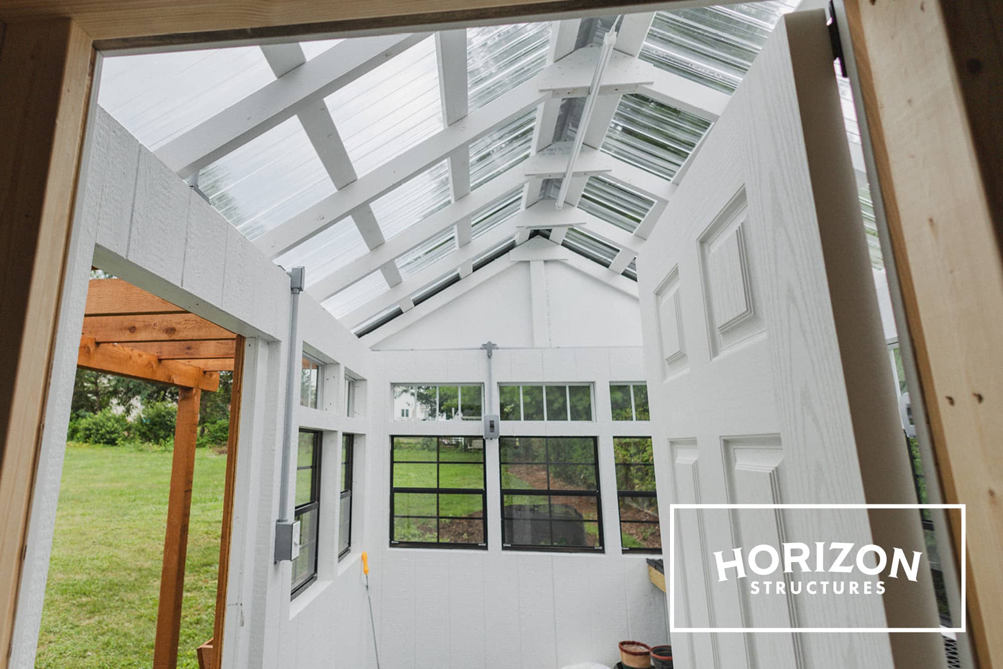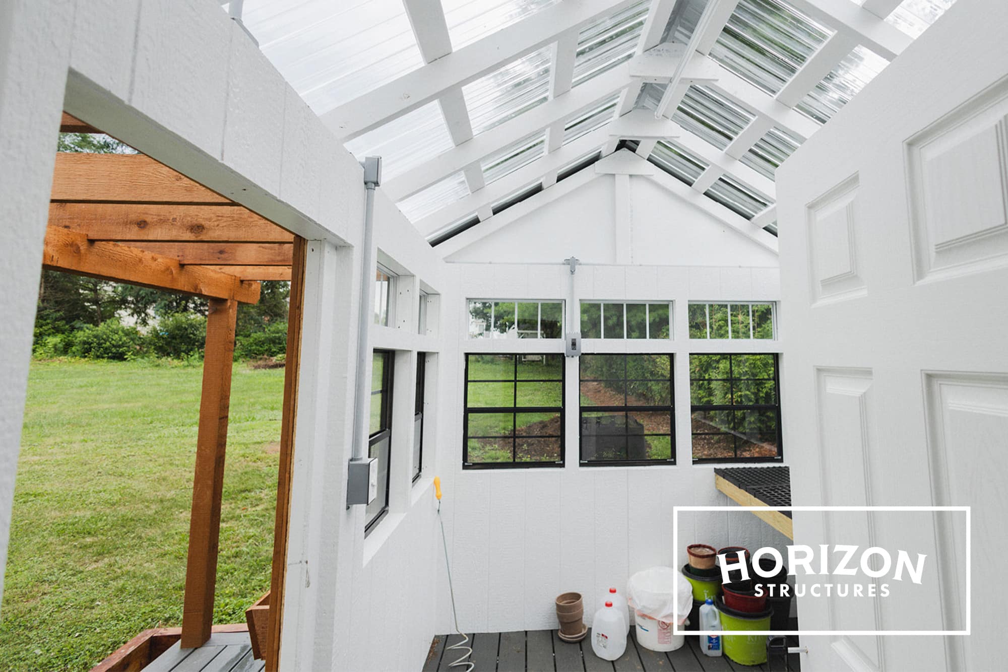This greenhouse/shed combo brings real function and craftsmanship together. The greenhouse side is finished in bright white with clear poly roofing and oversized windows, giving you tons of natural light for seed starting, potting, and plant care. Inside, you’ve got sturdy workbenches, ventilation fans, and plenty of room to organize trays and tools.