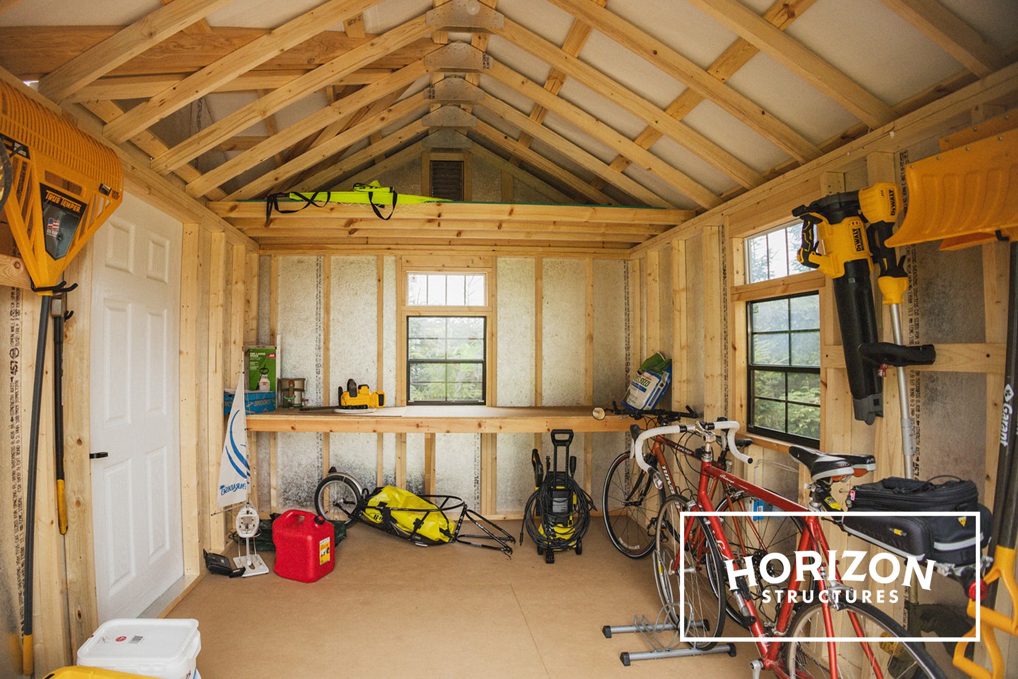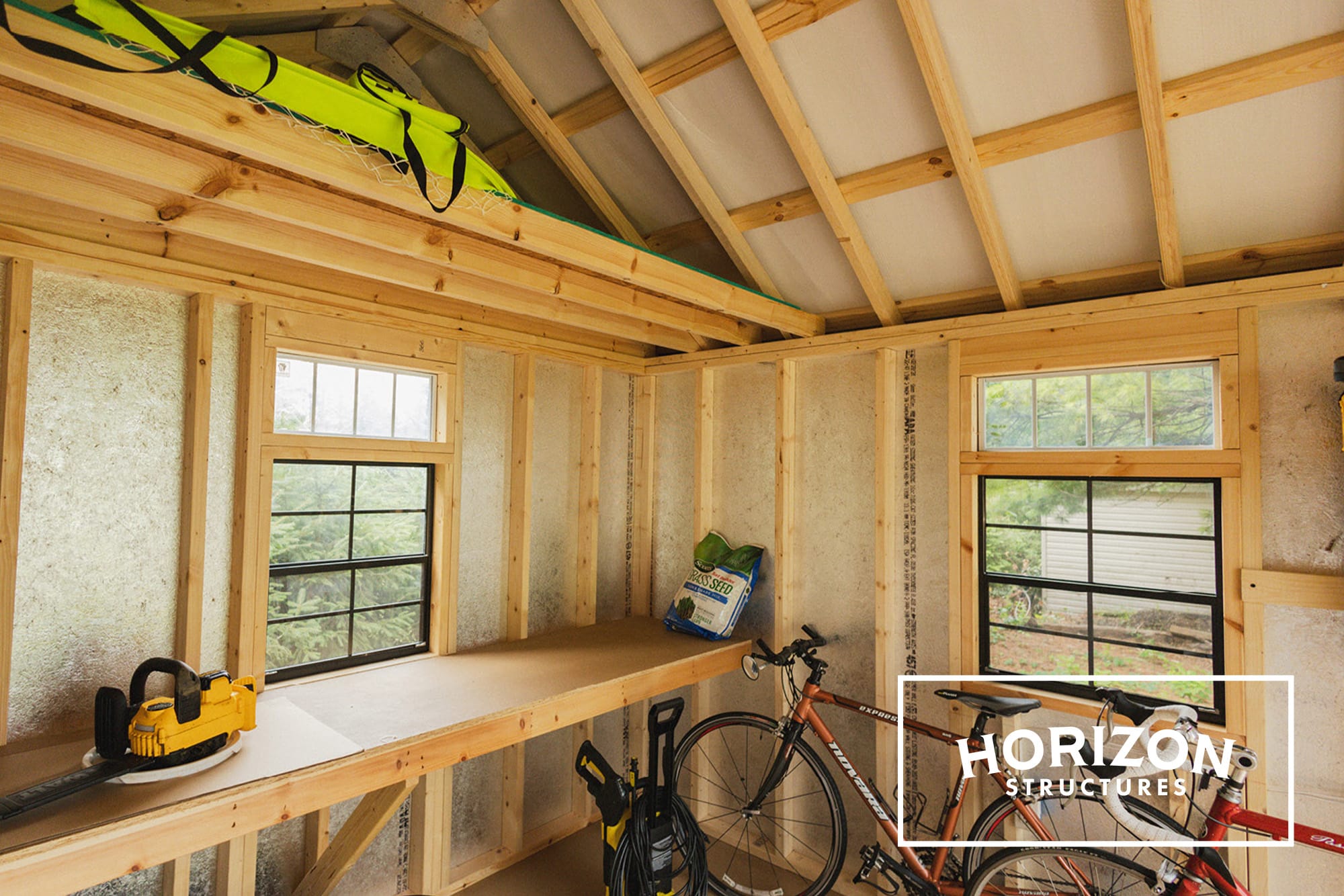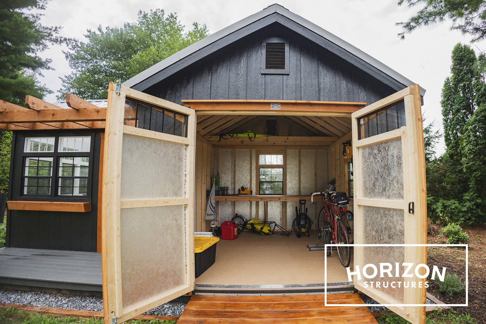On the shed side, the natural-wood double doors open into a fully framed storage area with loft space and a built-in workbench, perfect for bikes, tools, gardening gear, or outdoor equipment.