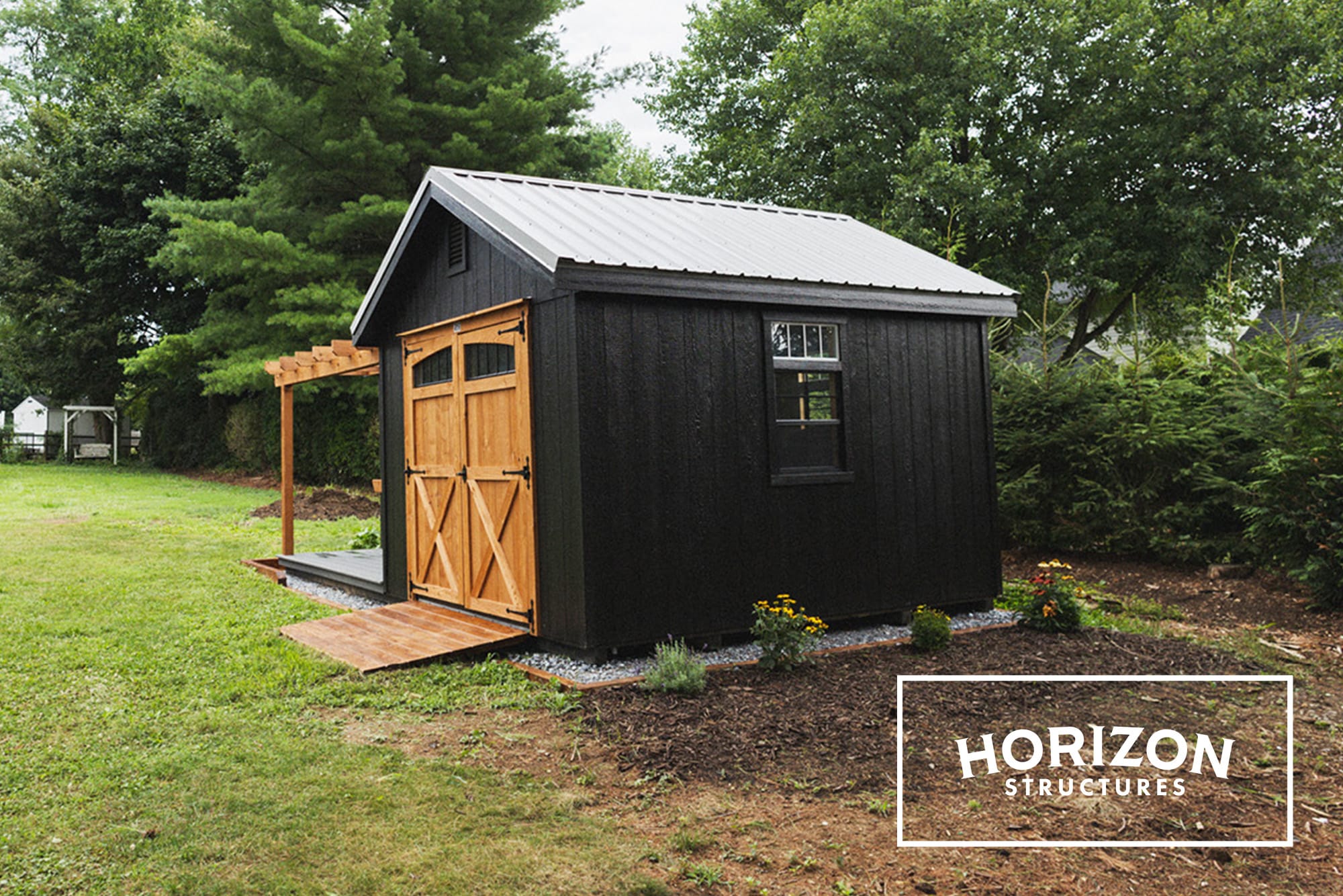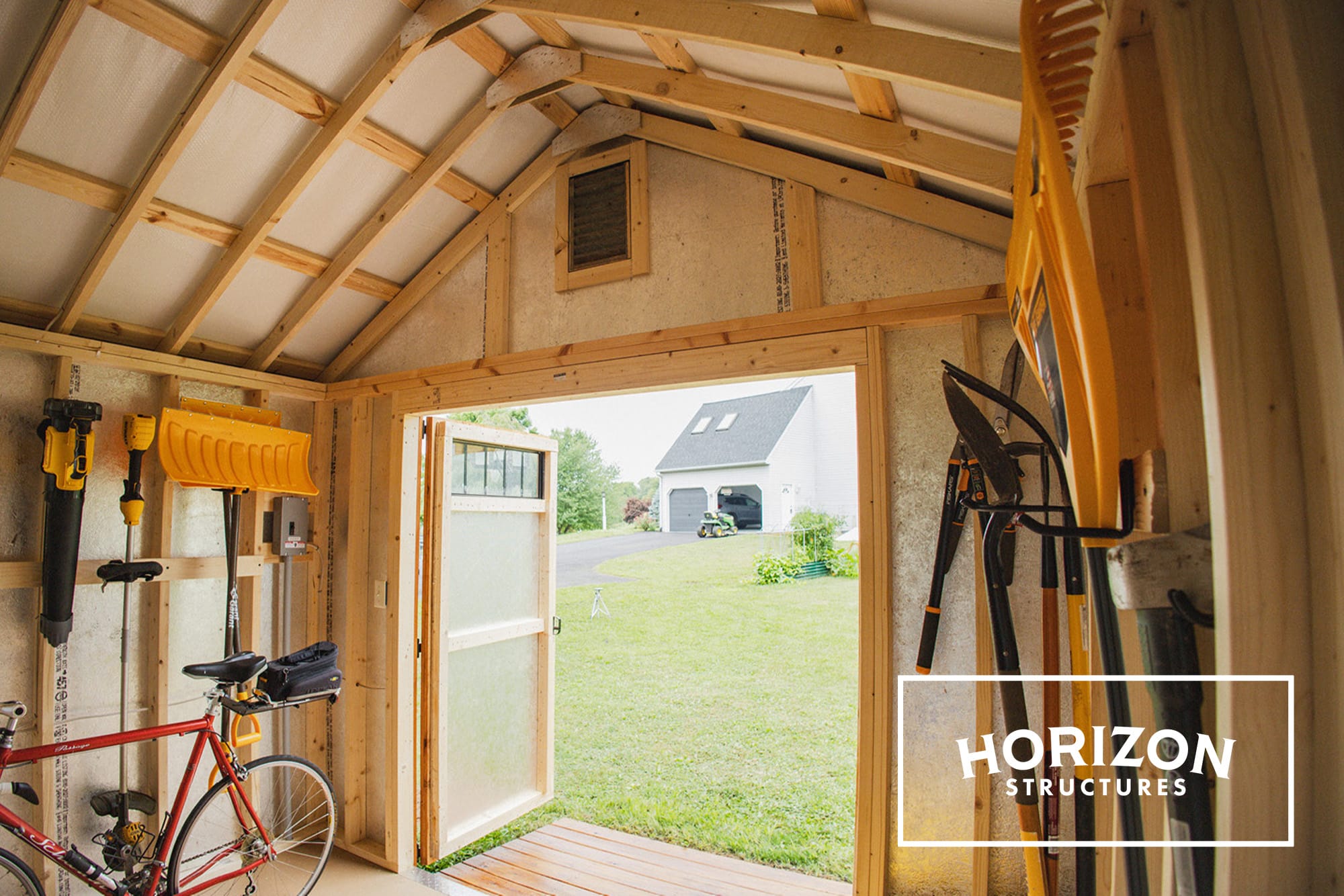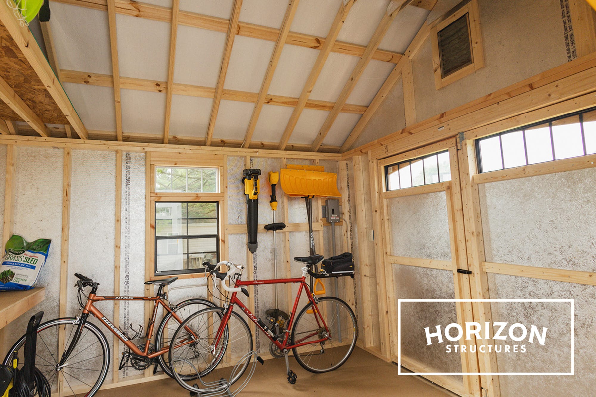 On the shed side, the natural-wood double doors open into a fully framed storage area with loft space and a built-in workbench, perfect for bikes, tools, gardening gear, or outdoor equipment.