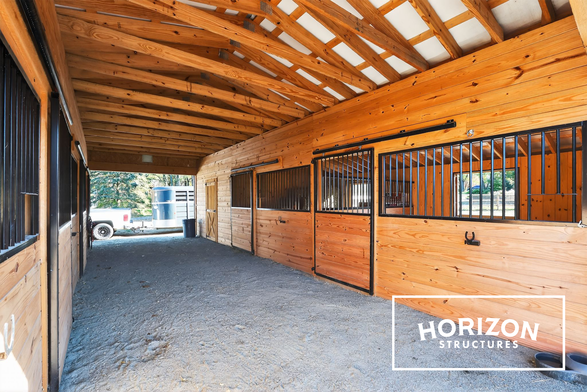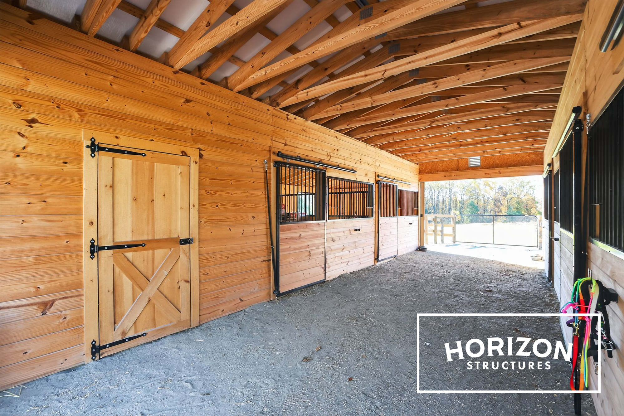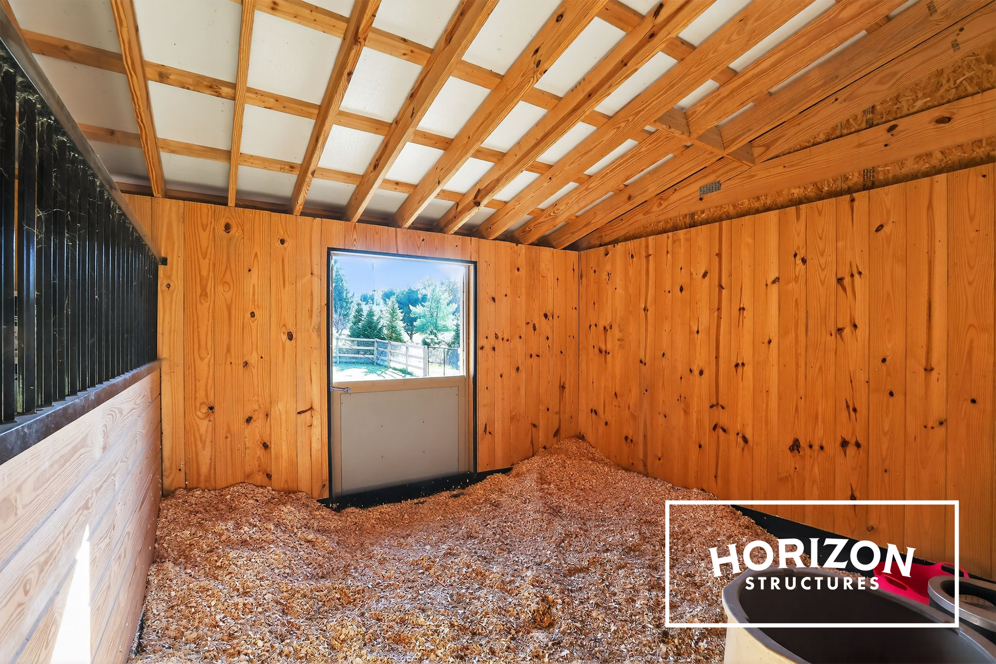 This build features LP SmartSide board and batten siding for long-term durability and low maintenance, tongue and groove kickboards throughout the interior for a polished, natural look, and windows built directly into the sliding aisle doors for added natural light and ventilation. Every detail of this barn was designed for function, strength, and visual balance.