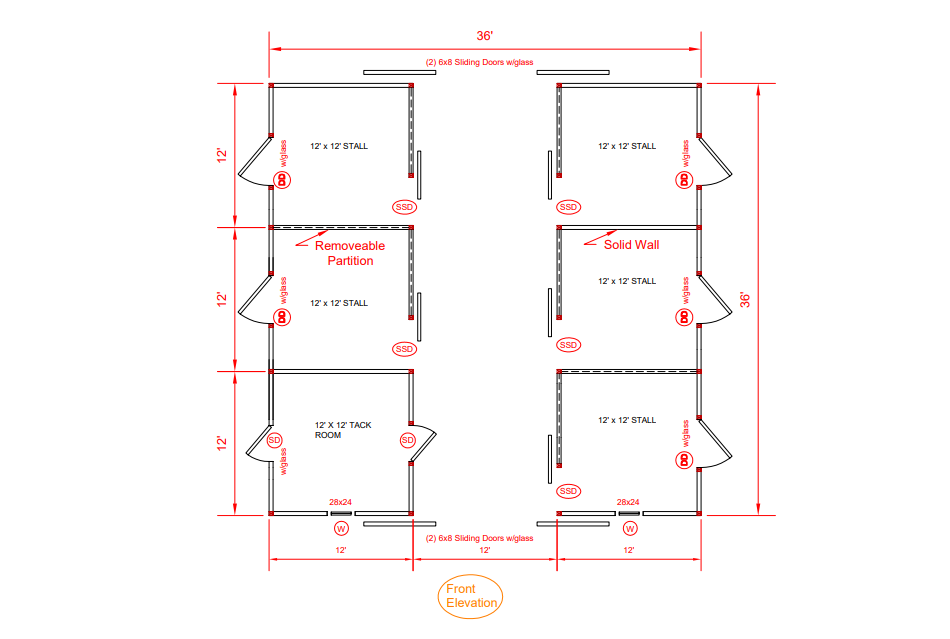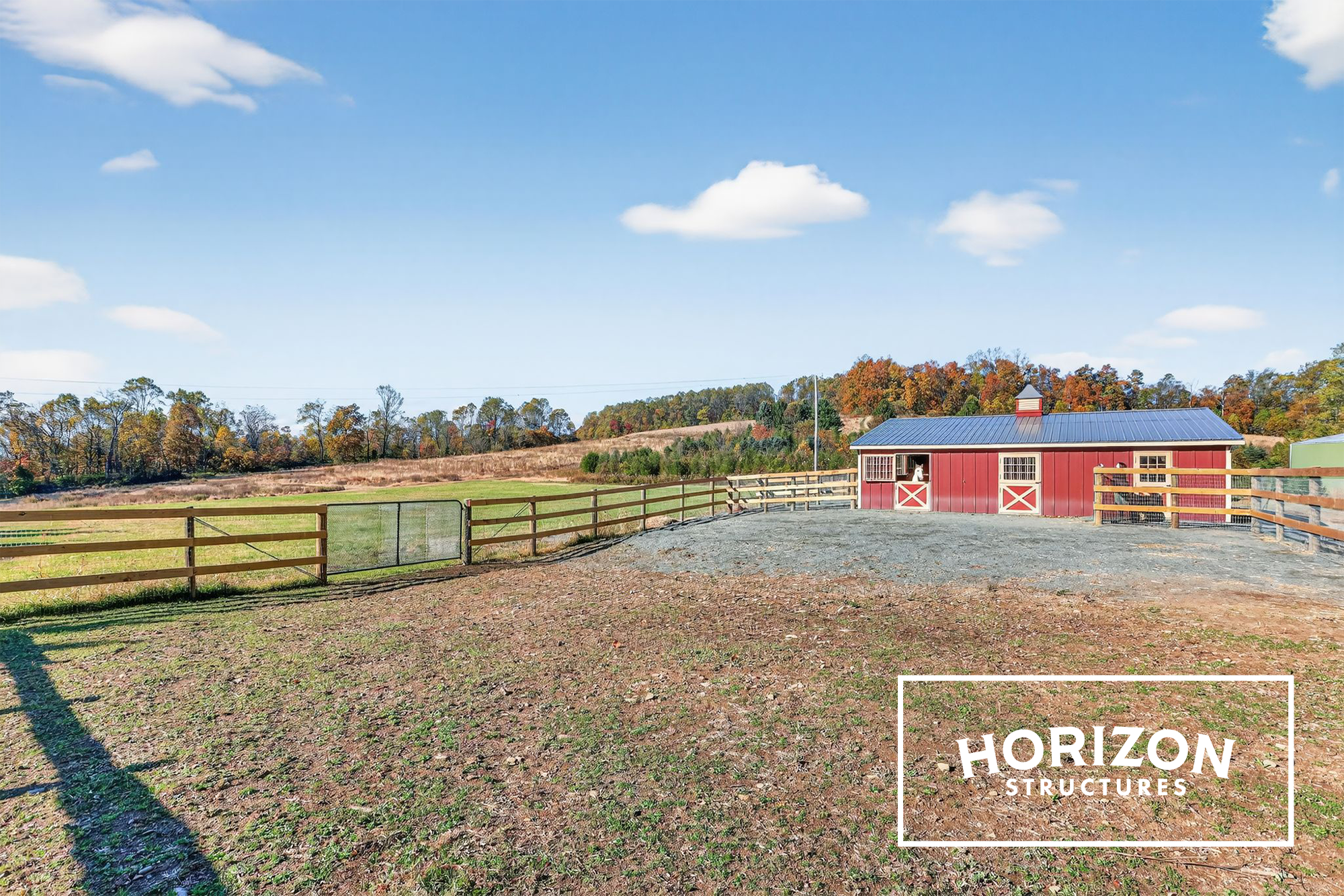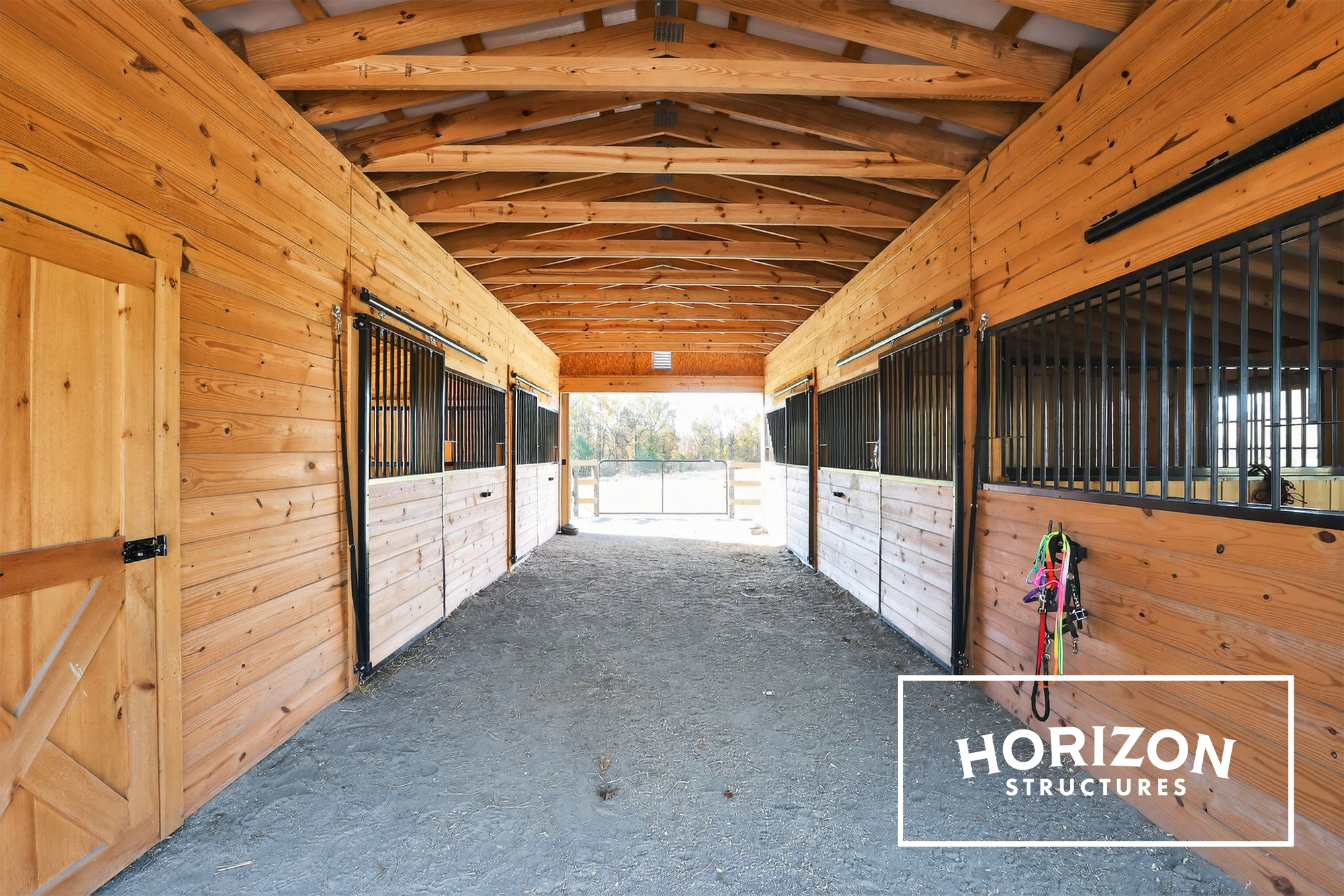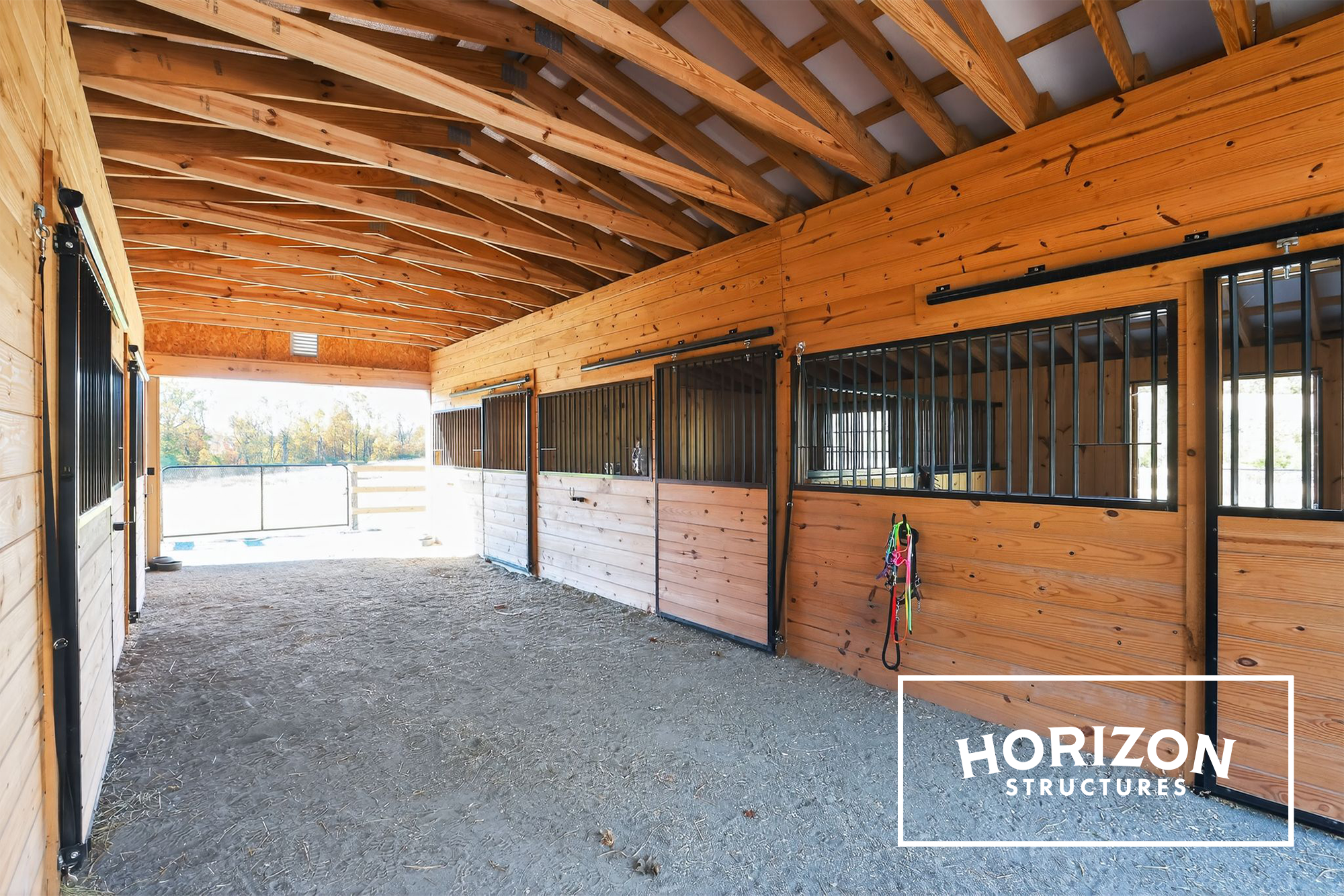 This build features LP SmartSide board and batten siding for long-term durability and low maintenance, tongue and groove kickboards throughout the interior for a polished, natural look, and windows built directly into the sliding aisle doors for added natural light and ventilation. Every detail of this barn was designed for function, strength, and visual balance.