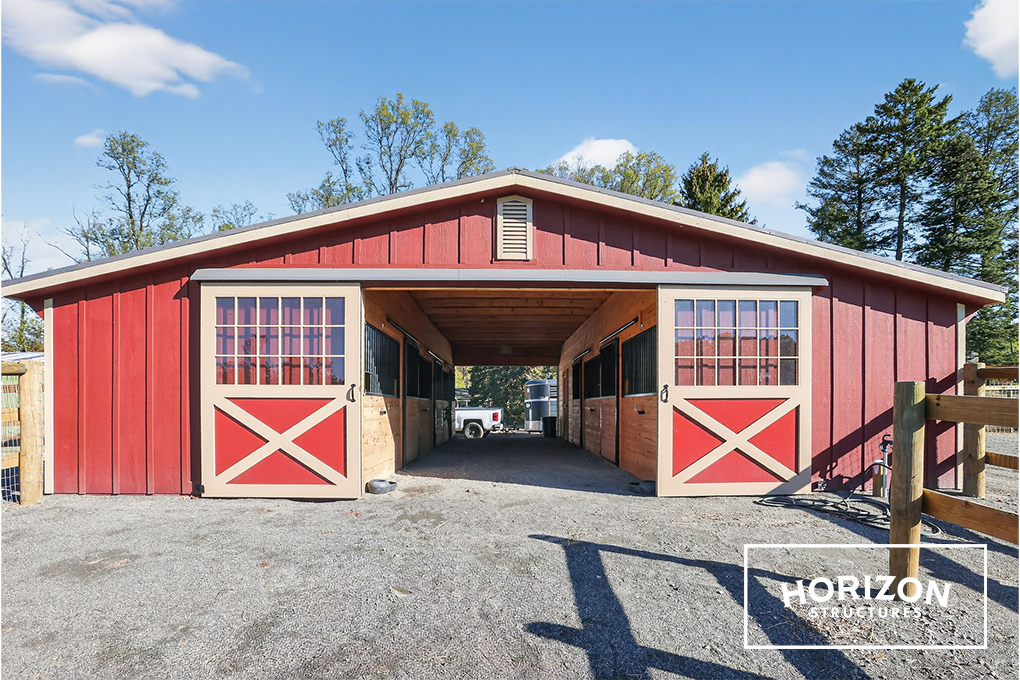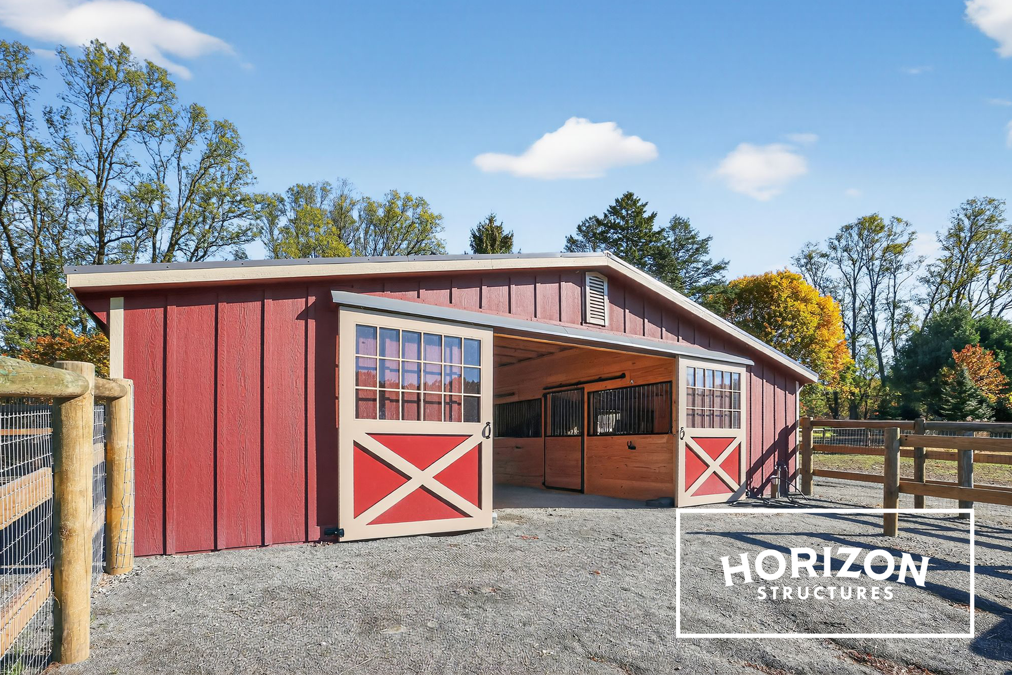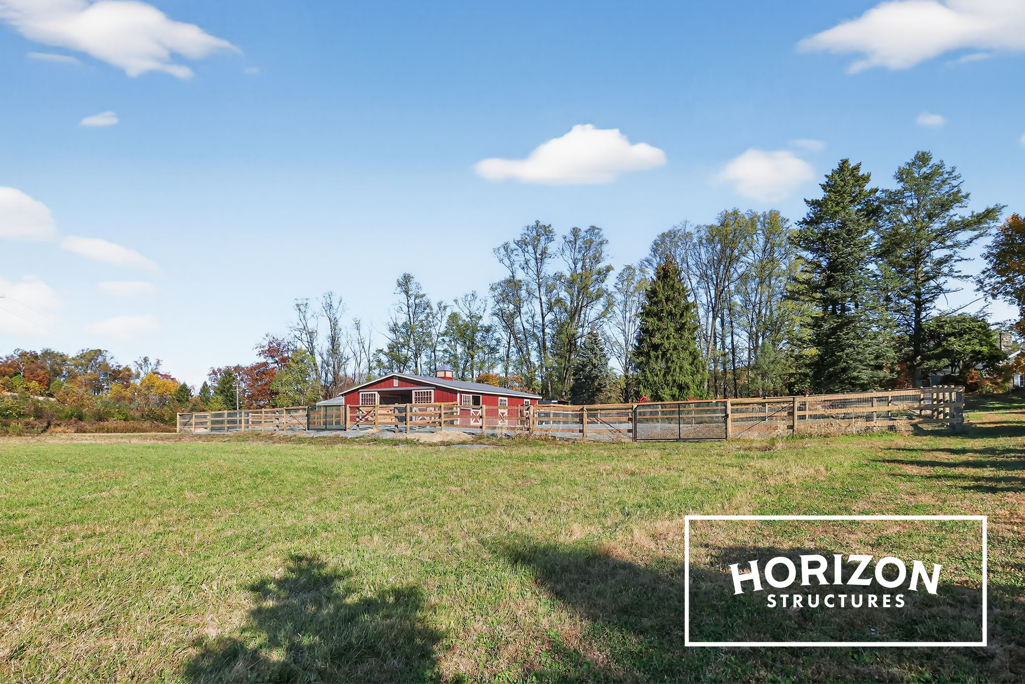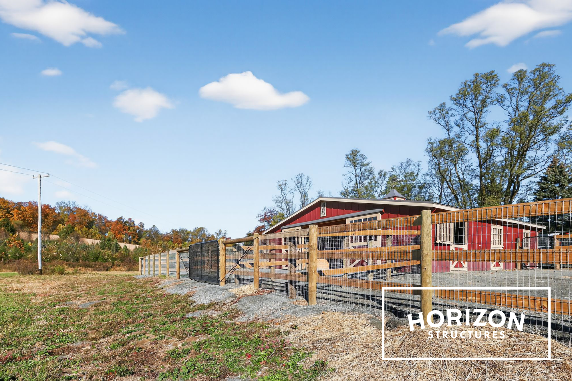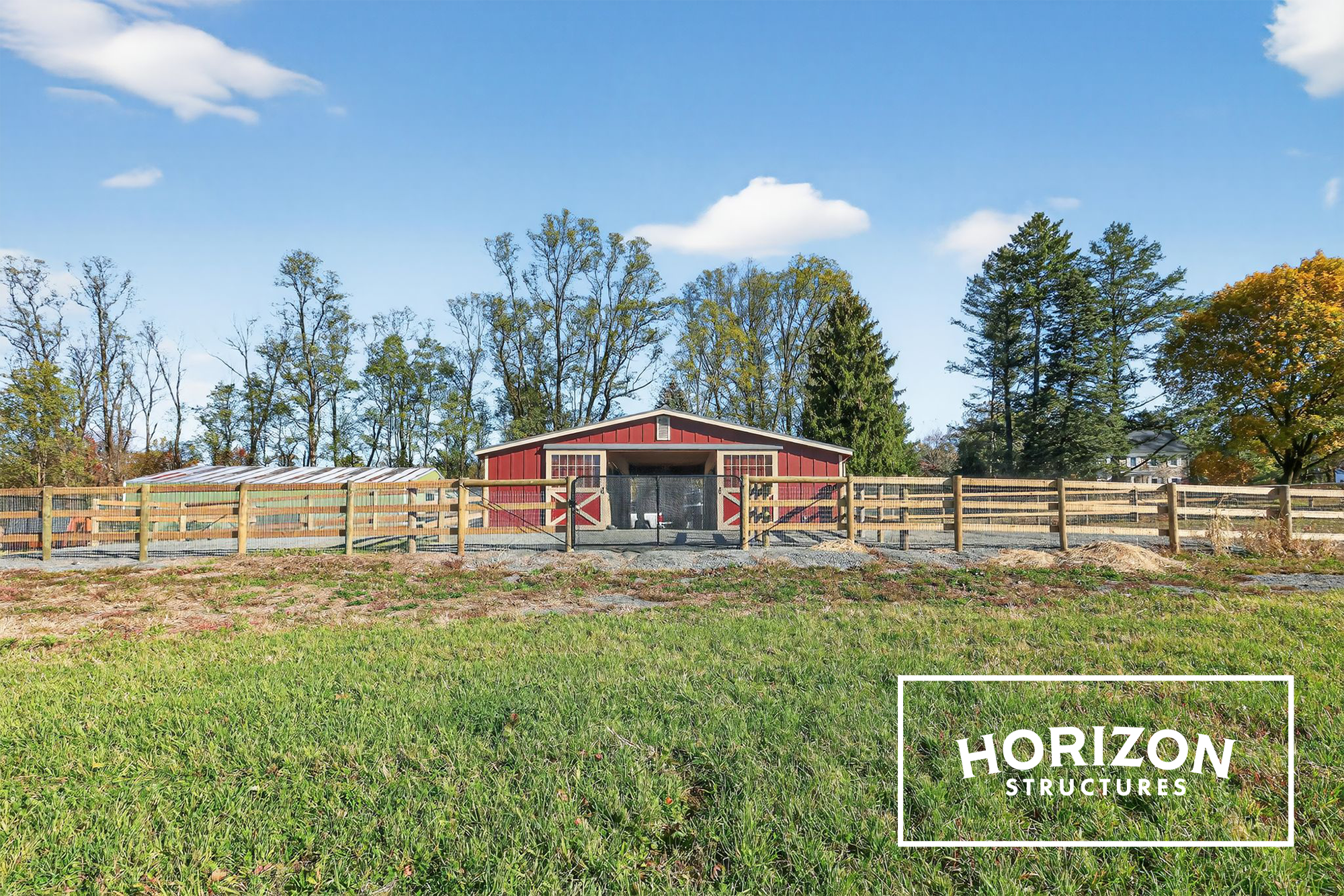 This low-profile barn in Barto, Pennsylvania, is a perfect blend of classic style and modern materials. The bold red LP SmartSide board-and-batten siding gives it a durable, clean finish that stands up to the elements while maintaining timeless barn character. Its compact, efficient design makes it an ideal setup for small farms or private equestrian properties.