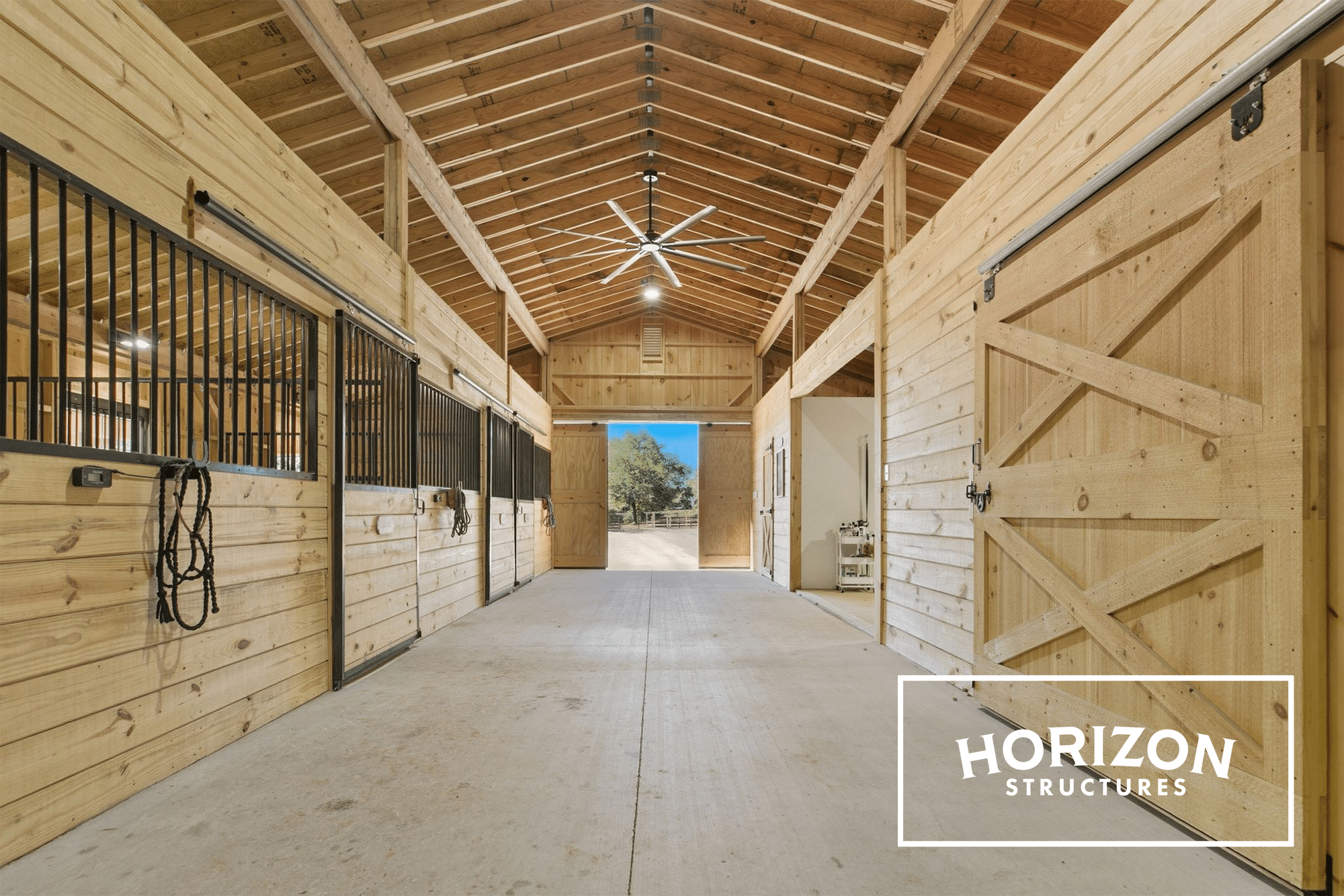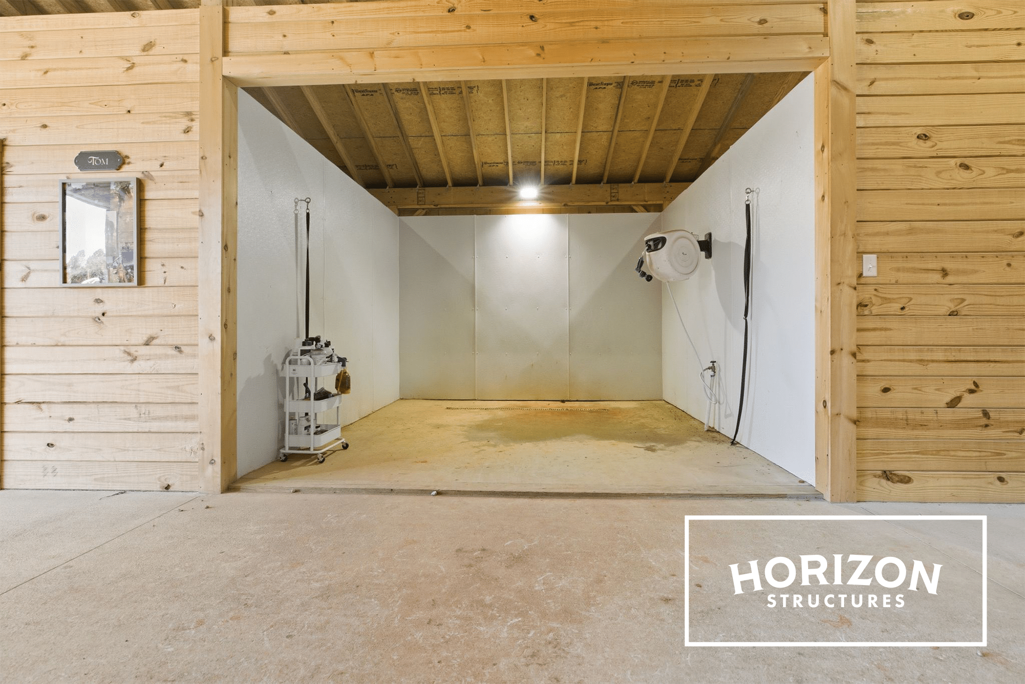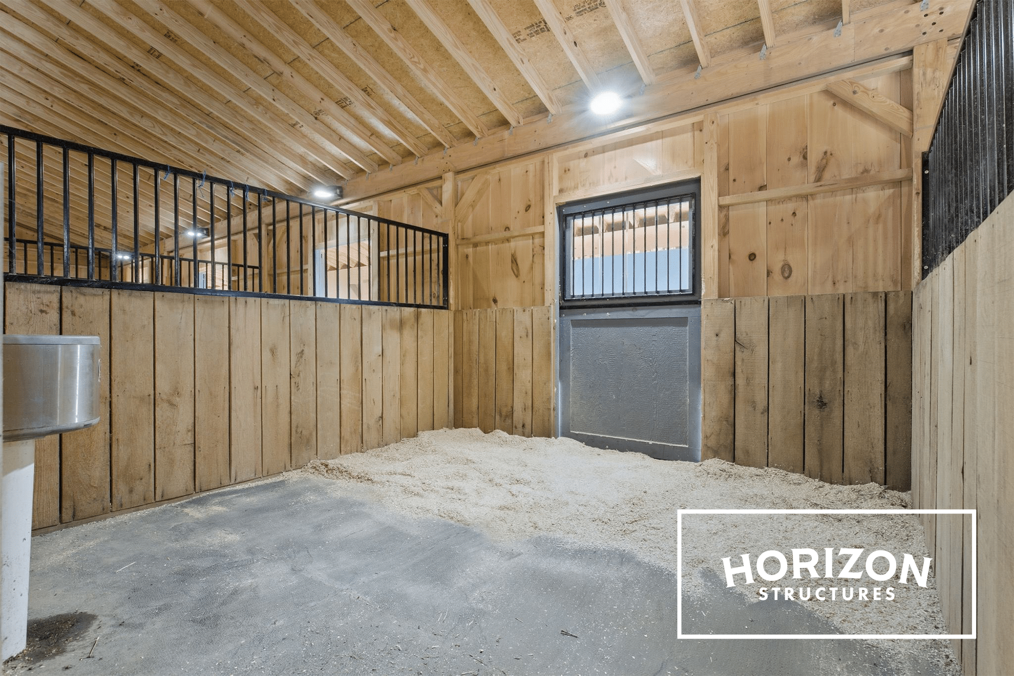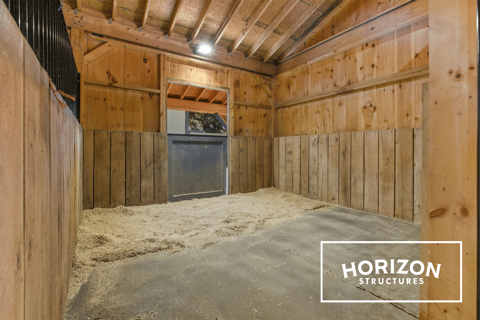 This barn includes a 6’ overhang that provides shade and shelter for grooming, tacking, or simply relaxing with the horses. Inside, the wash stall is outfitted for convenience and easy maintenance, while a large sliding tack room door makes access simple and keeps the layout open. The design combines practical flow with thoughtful details, creating a space that looks great and works even better.
