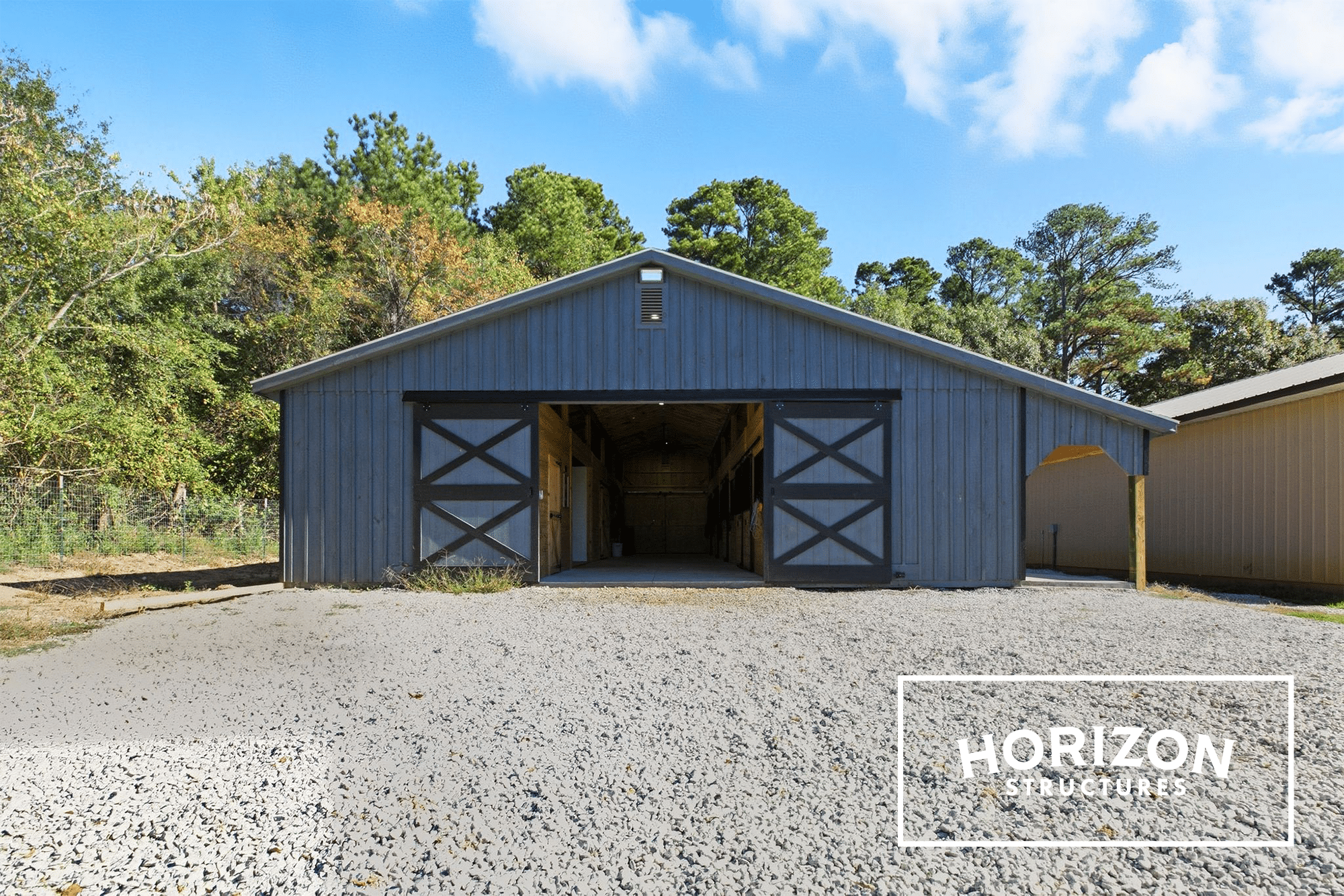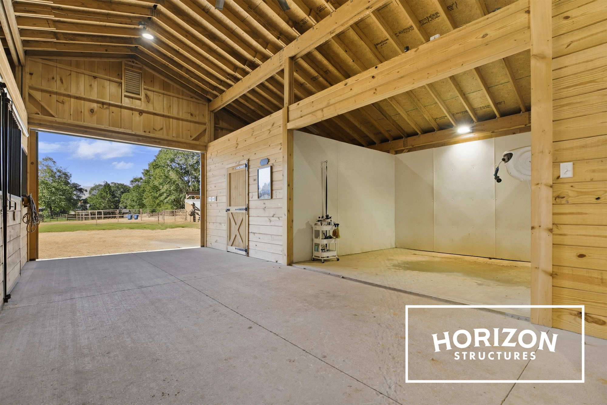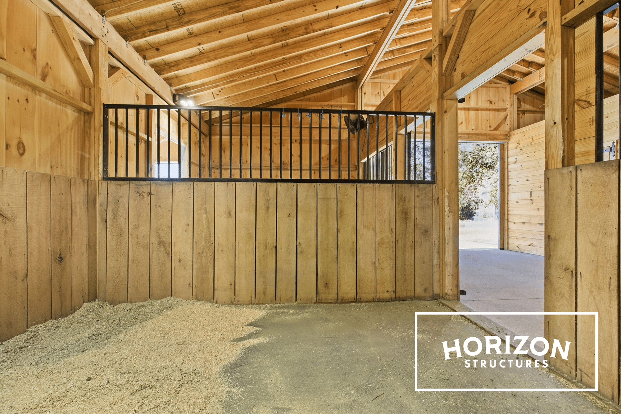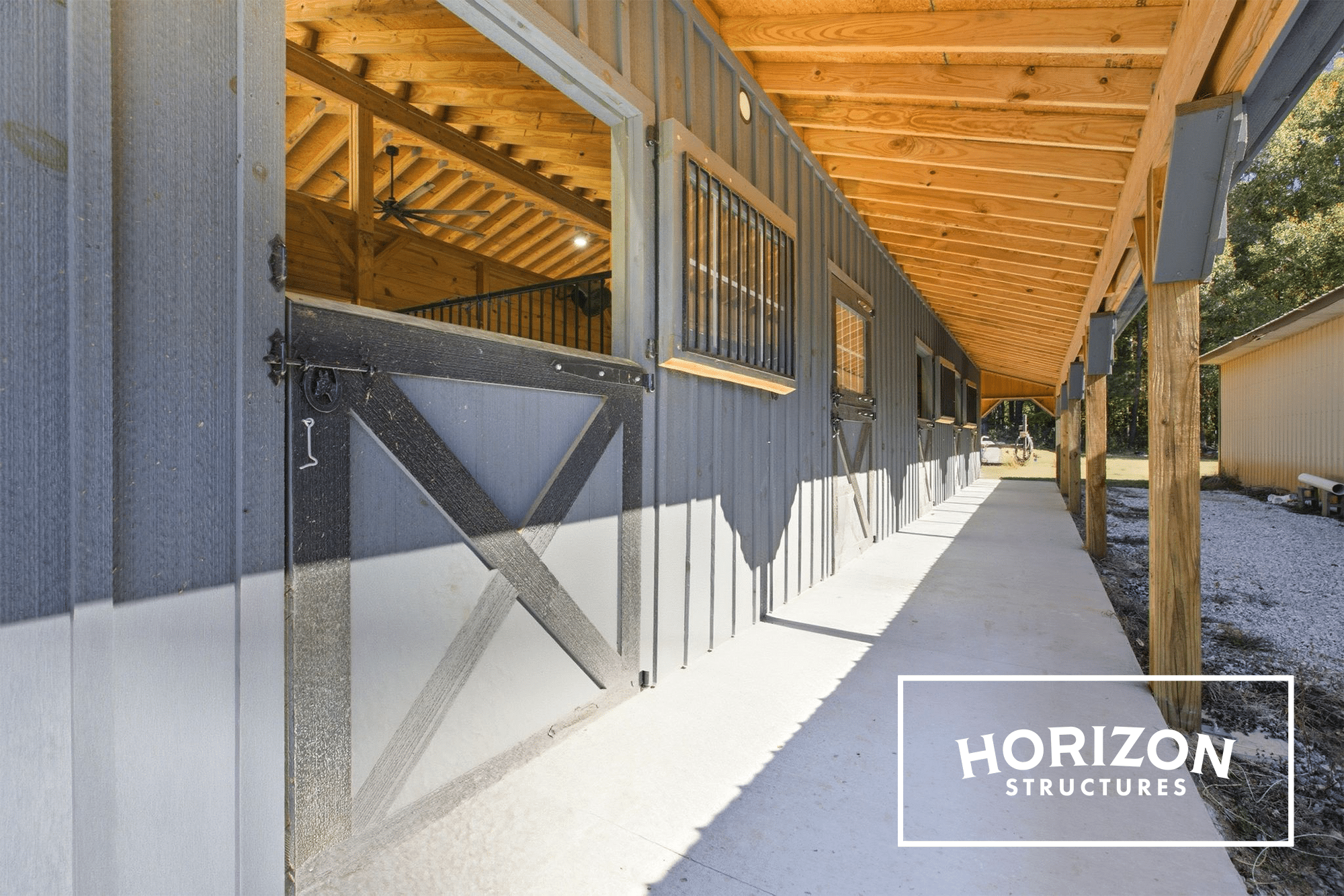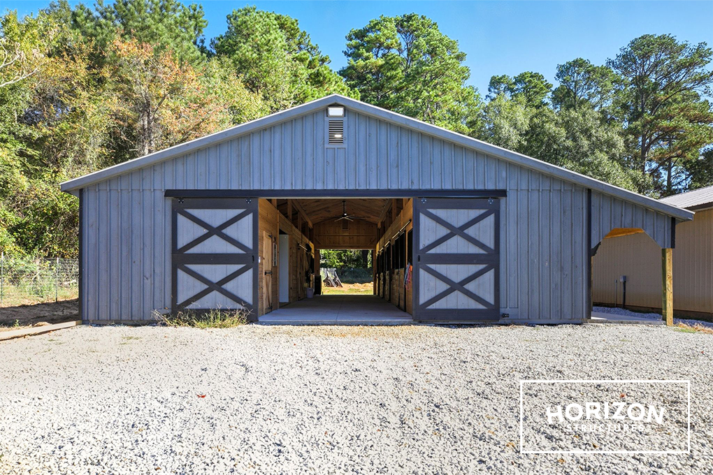 This Low Profile barn in Taylors, South Carolina, was built with both style and efficiency in mind. The board and batten siding, paired with natural wood accents, gives it a warm look that blends seamlessly with its wooded surroundings. It’s a setup that’s as functional as it is inviting, ideal for daily care and long-term durability.