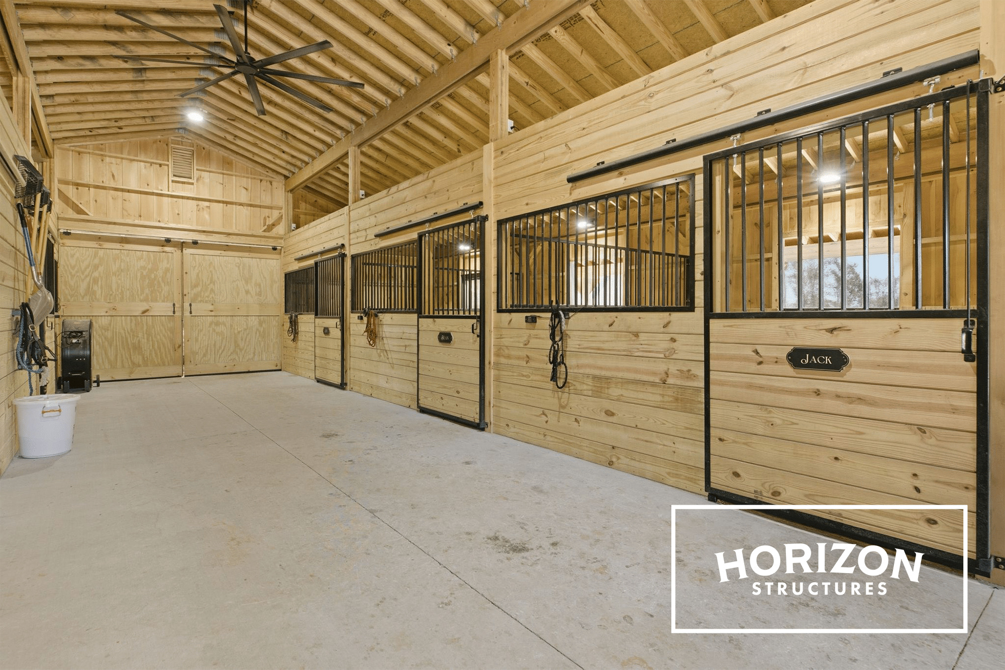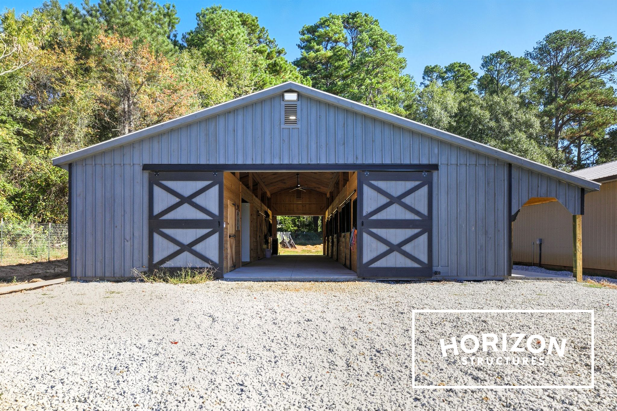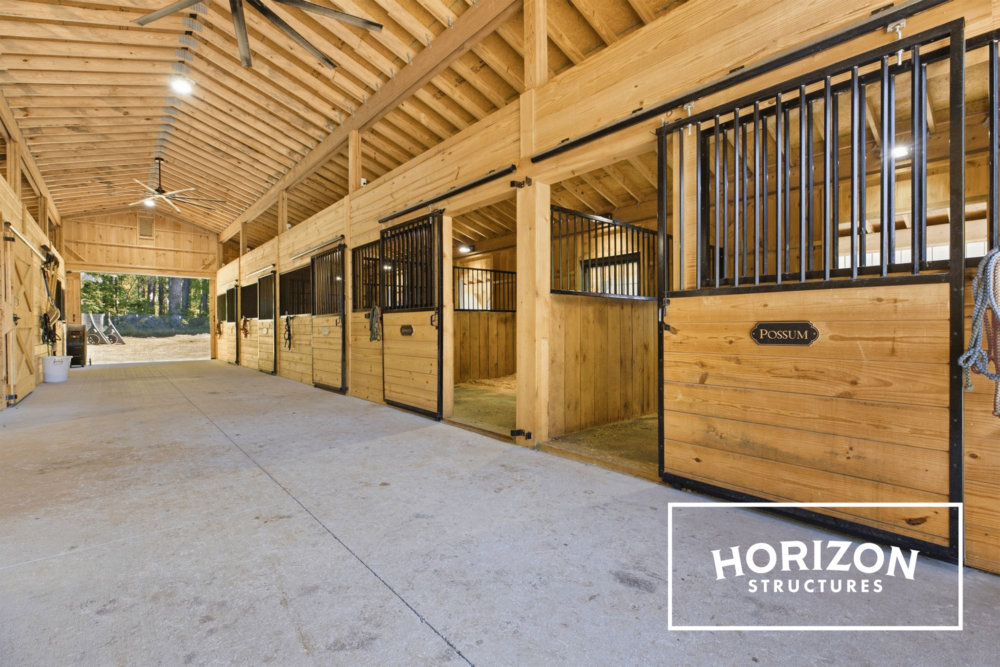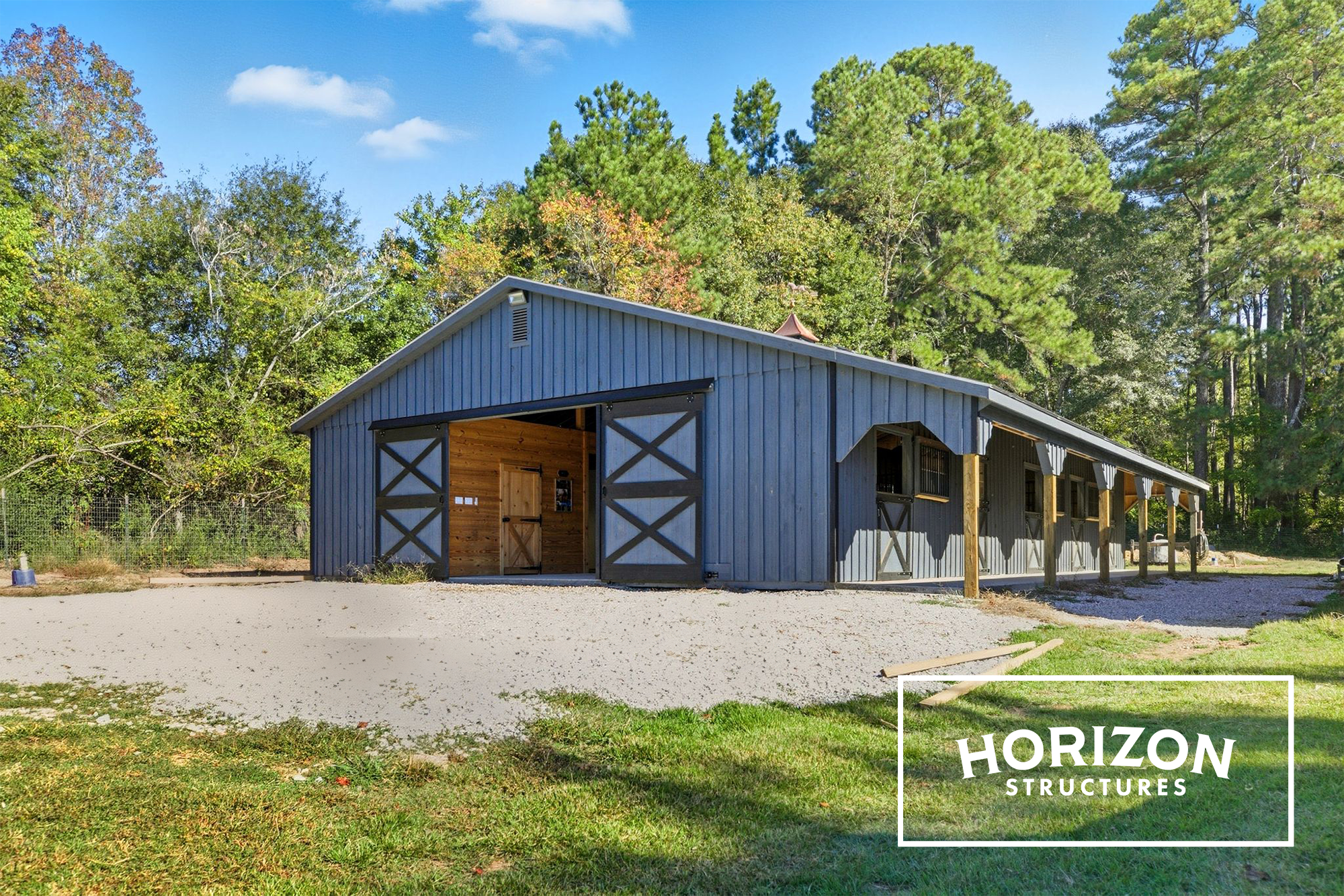 This Low Profile barn in Taylors, South Carolina, was built with both style and efficiency in mind. The board and batten siding, paired with natural wood accents, gives it a warm look that blends seamlessly with its wooded surroundings. It’s a setup that’s as functional as it is inviting, ideal for daily care and long-term durability.