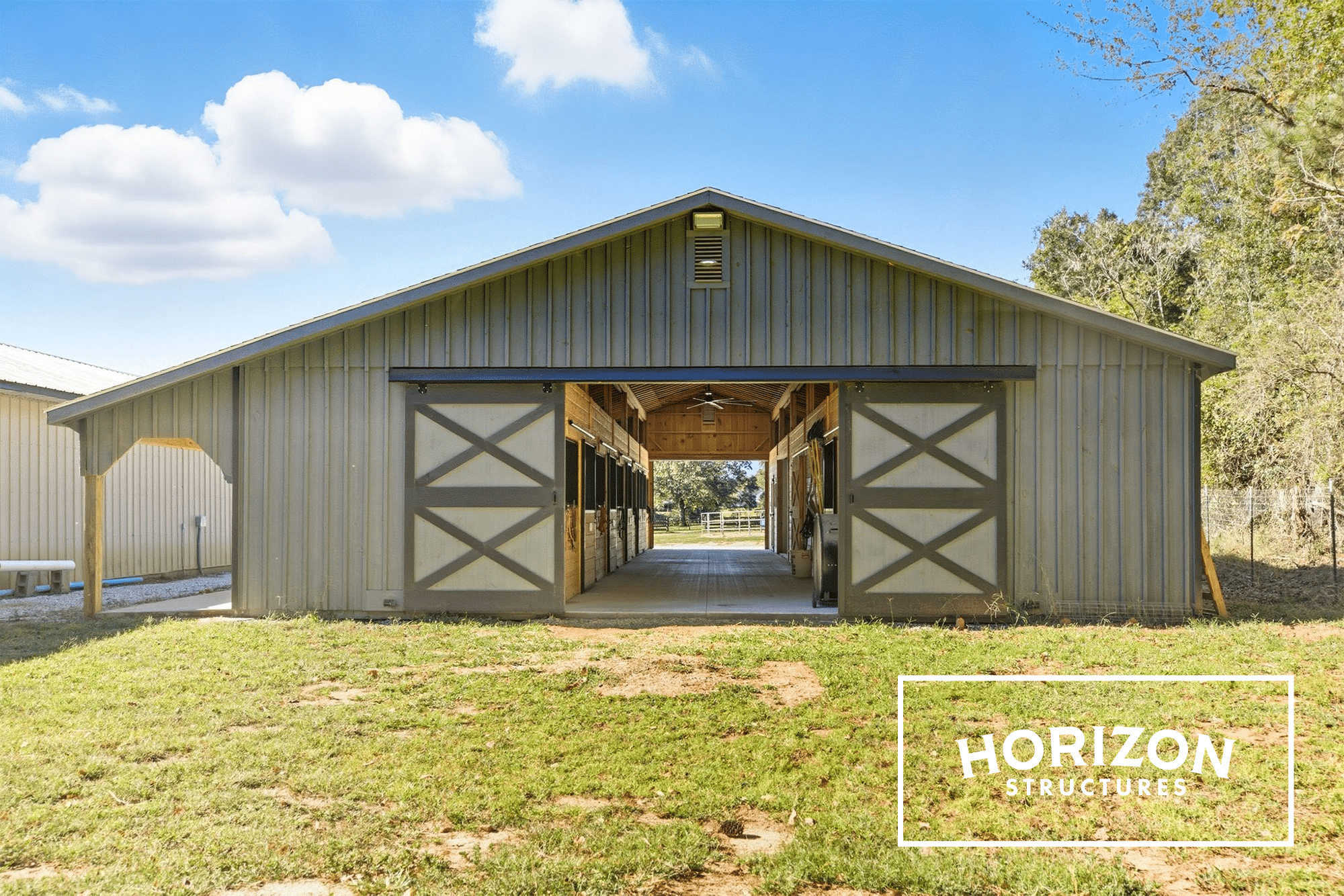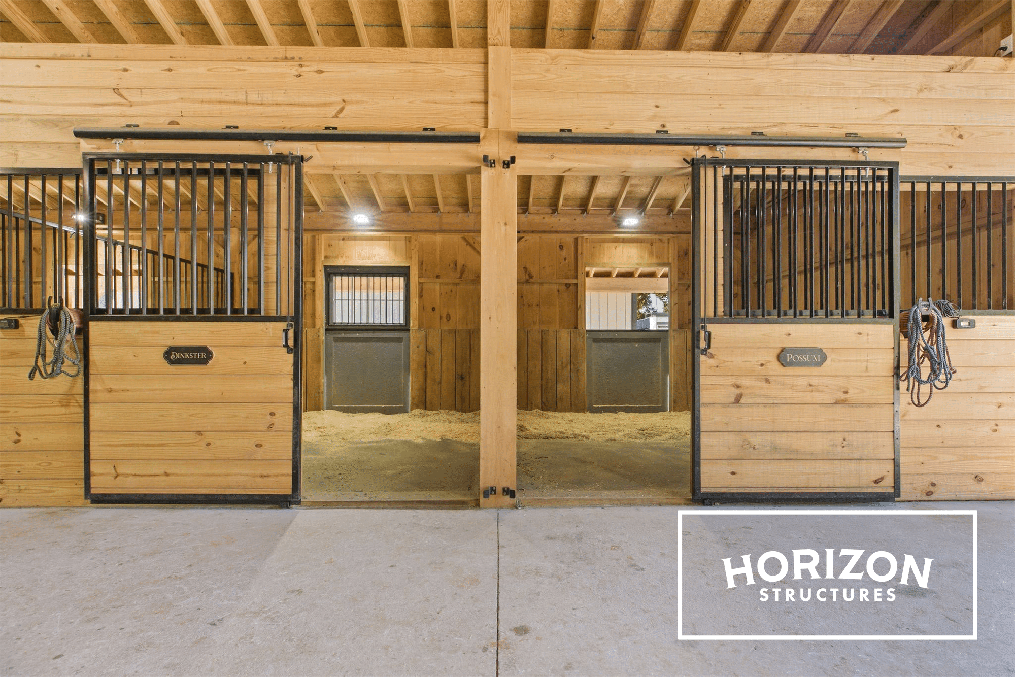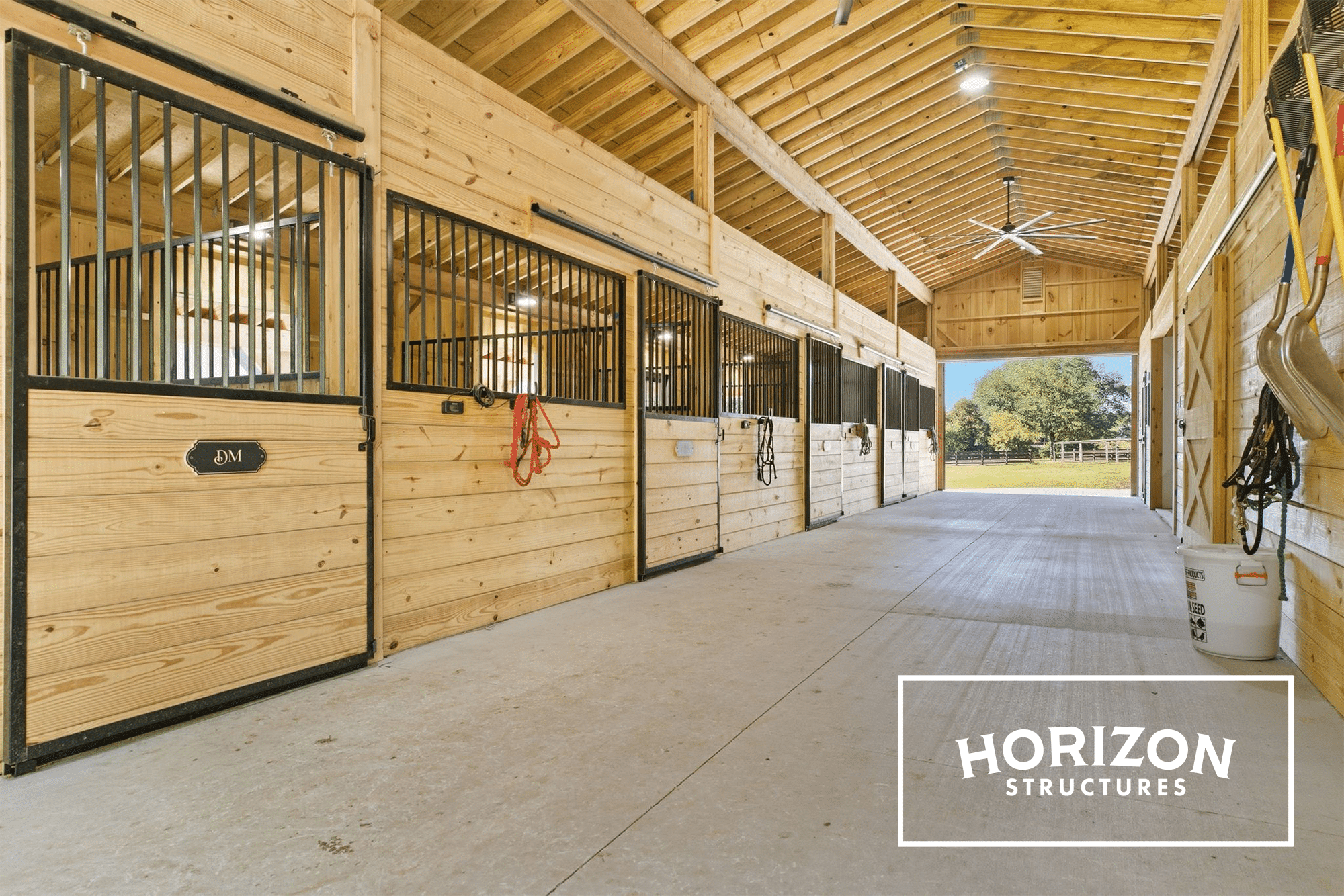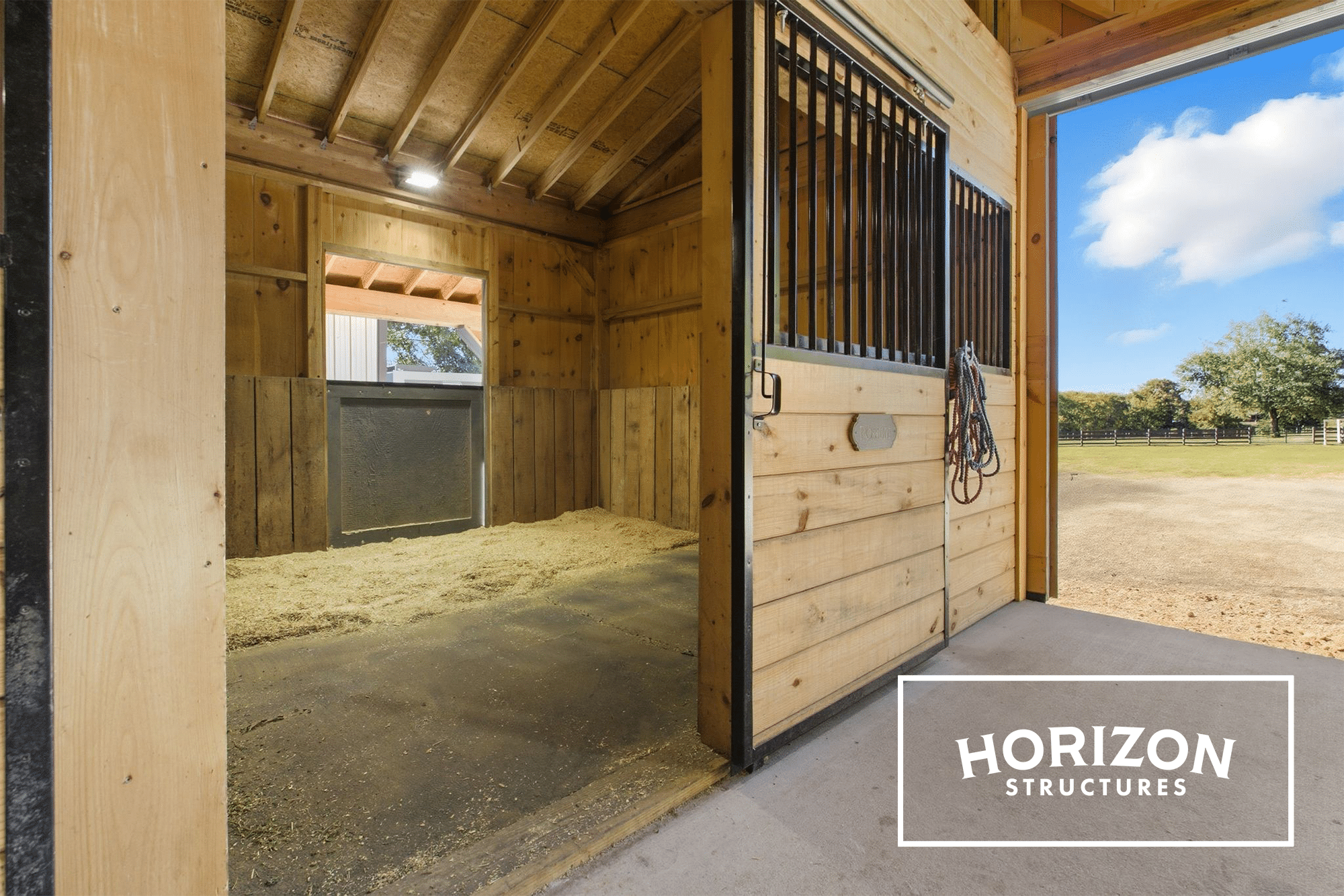 This Low Profile barn in Taylors, South Carolina, was built with both style and efficiency in mind. The board and batten siding, paired with natural wood accents, gives it a warm look that blends seamlessly with its wooded surroundings. It’s a setup that’s as functional as it is inviting, ideal for daily care and long-term durability.