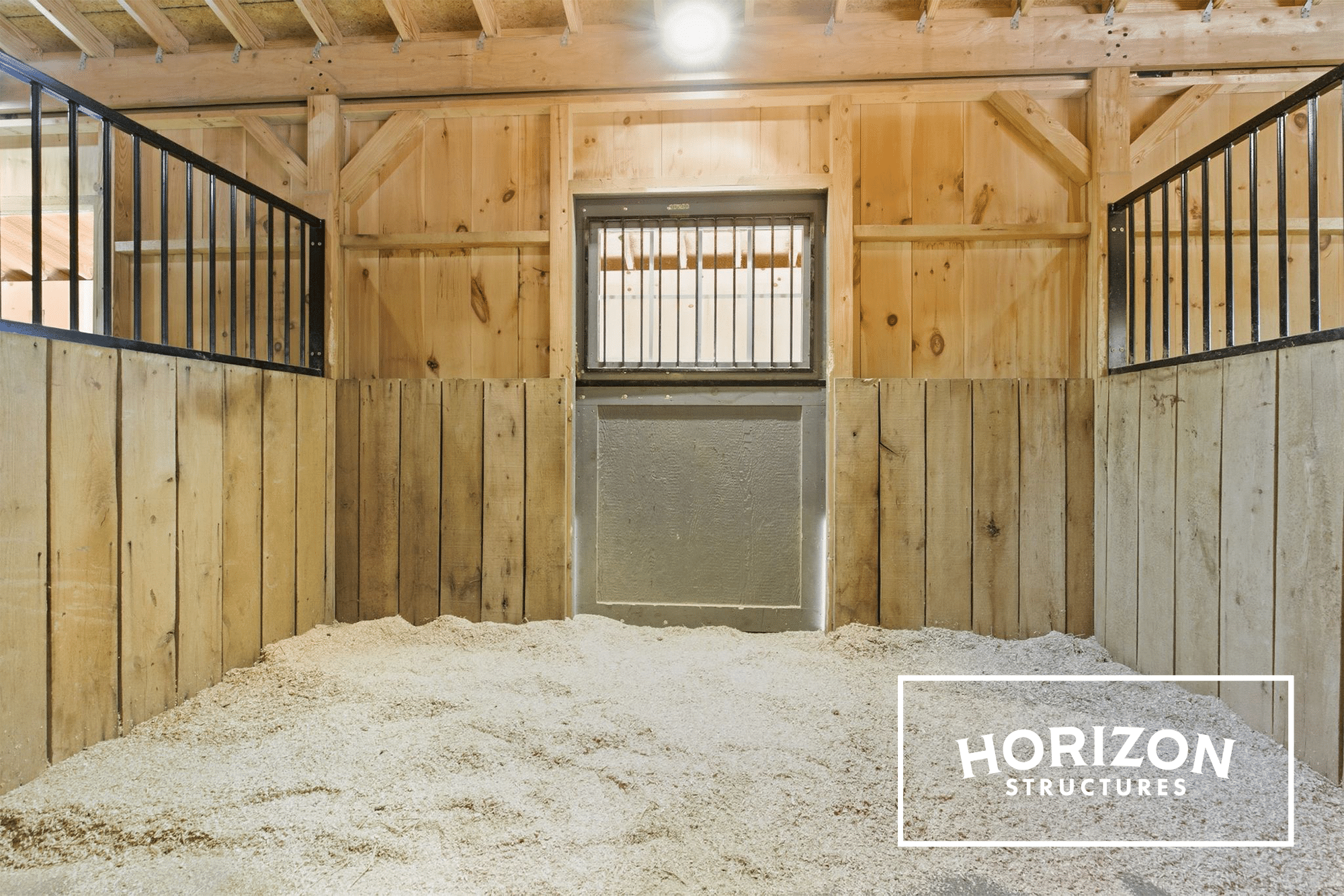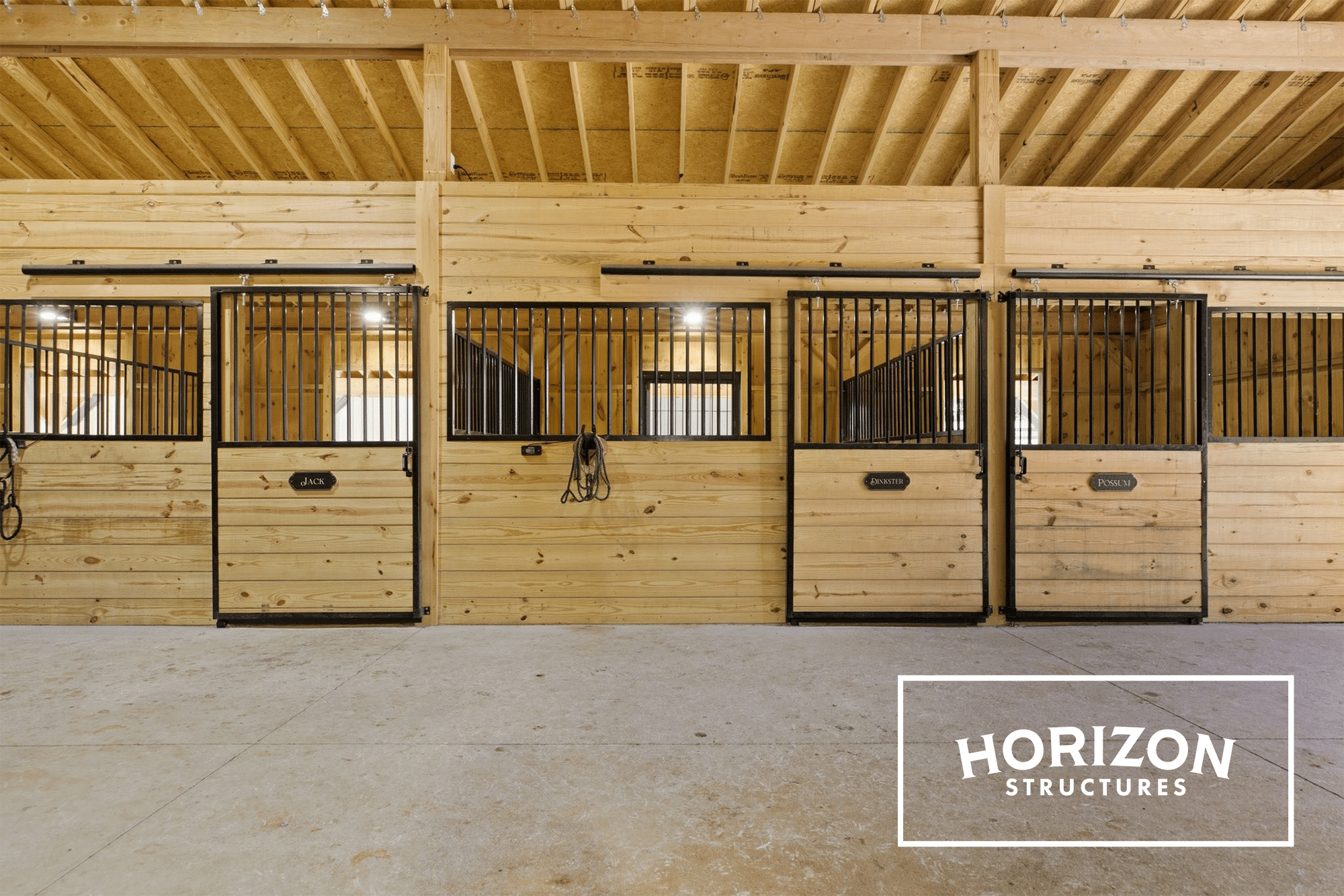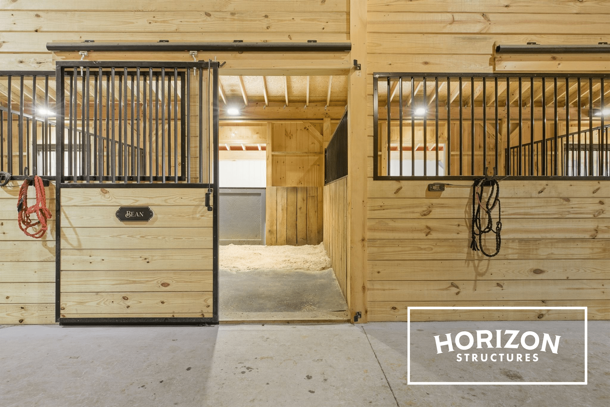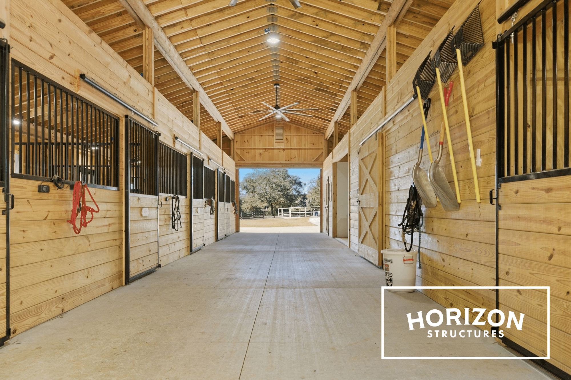 This Low Profile barn in Taylors, South Carolina, was built with both style and efficiency in mind. The board and batten siding, paired with natural wood accents, gives it a warm look that blends seamlessly with its wooded surroundings. It’s a setup that’s as functional as it is inviting, ideal for daily care and long-term durability.