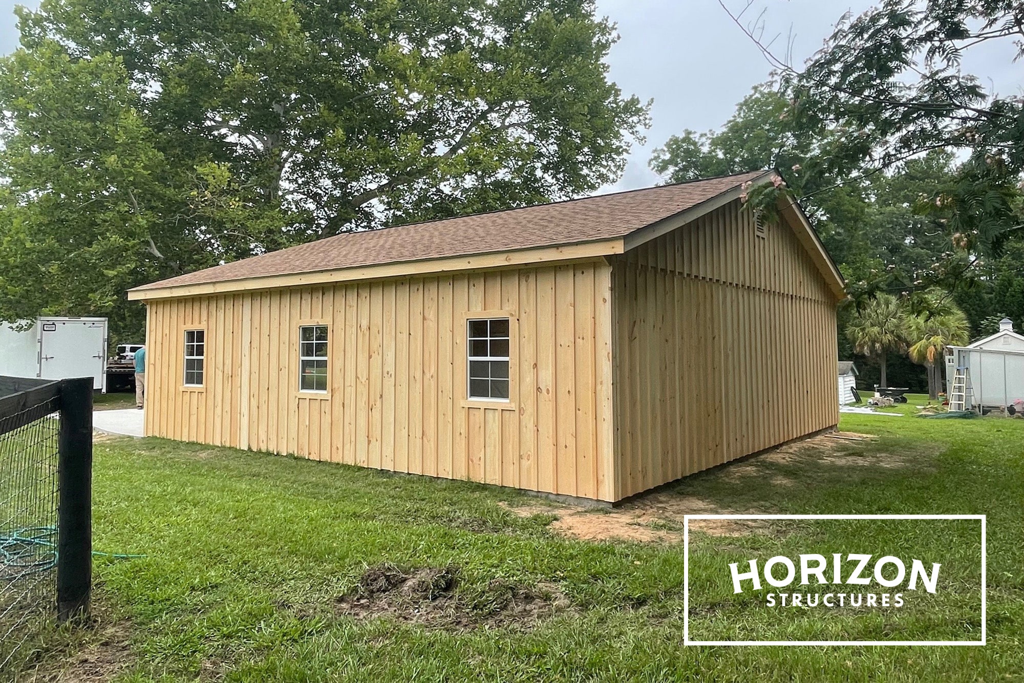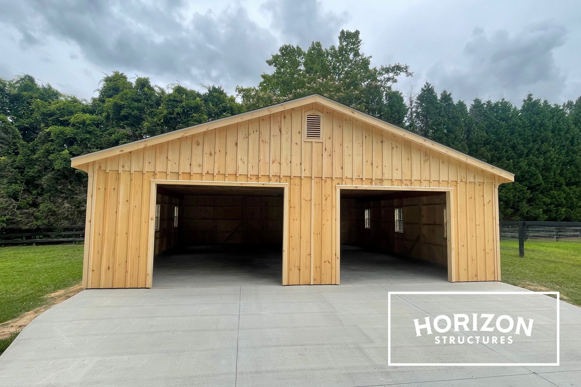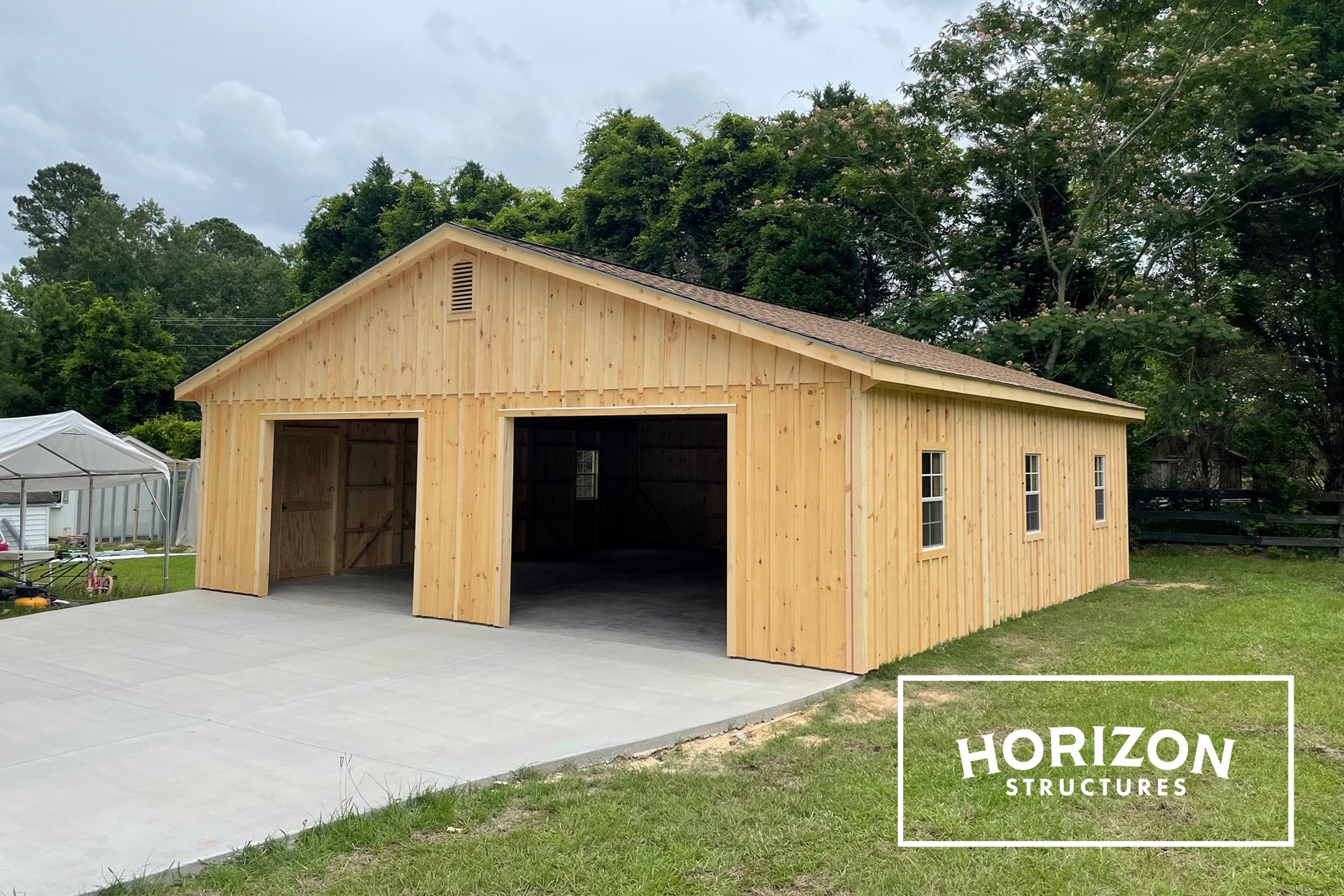 This simple 30’ x 30’ two-car garage in Aiken, South Carolina, was built to provide dependable storage and everyday functionality for a residential property. Featuring natural wood siding and a clean gable roofline, the structure has a straightforward look that fits well with the surrounding setting. The wide door openings allow for easy vehicle access, while the solid concrete floor and durable framing create a space that’s ready for long-term use.