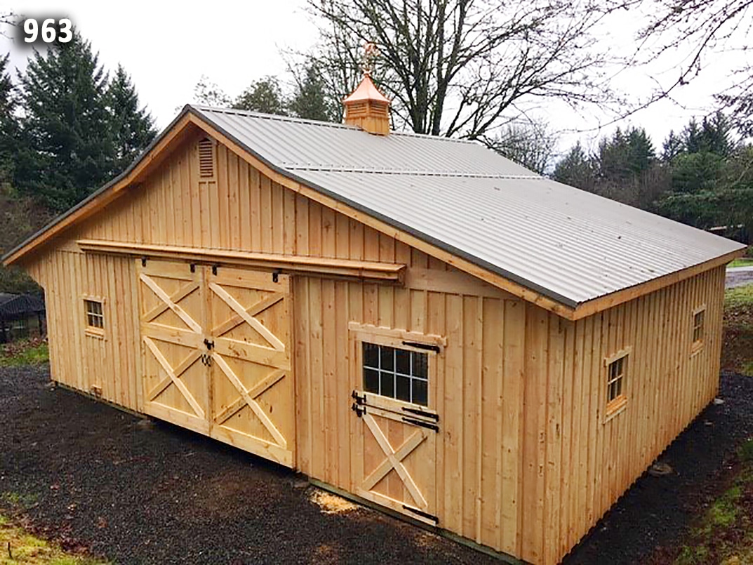 30×48 High Profile barn includes (5) 10×12 stalls, 10×24 stall, 10×12 tack room, (2) 10′ overhangs, metal roof, gable vents, ridge vent, upgrade loft door to double sliding door with window, upgrade stall windows to Dutch doors with windows/grills, windows in aisle doors, double 6×7 sliding door with window in 10×24 stall