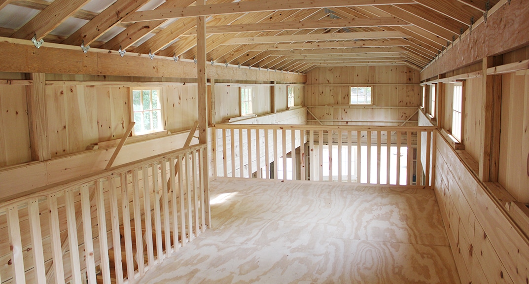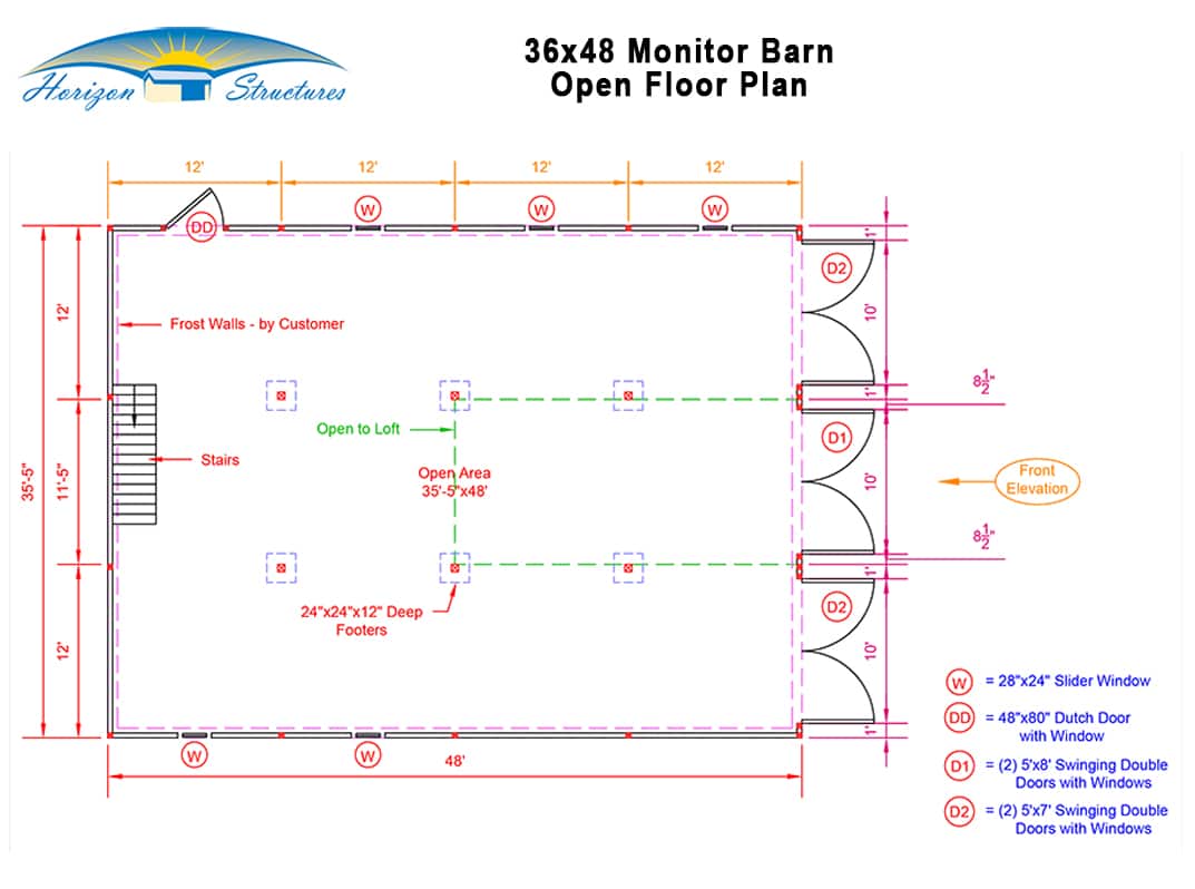 36×48 Monitor modular barn includes green metal roof, 4 sets of split hinged doors, tempered glass windows, Dutch door, loft, open floor plan