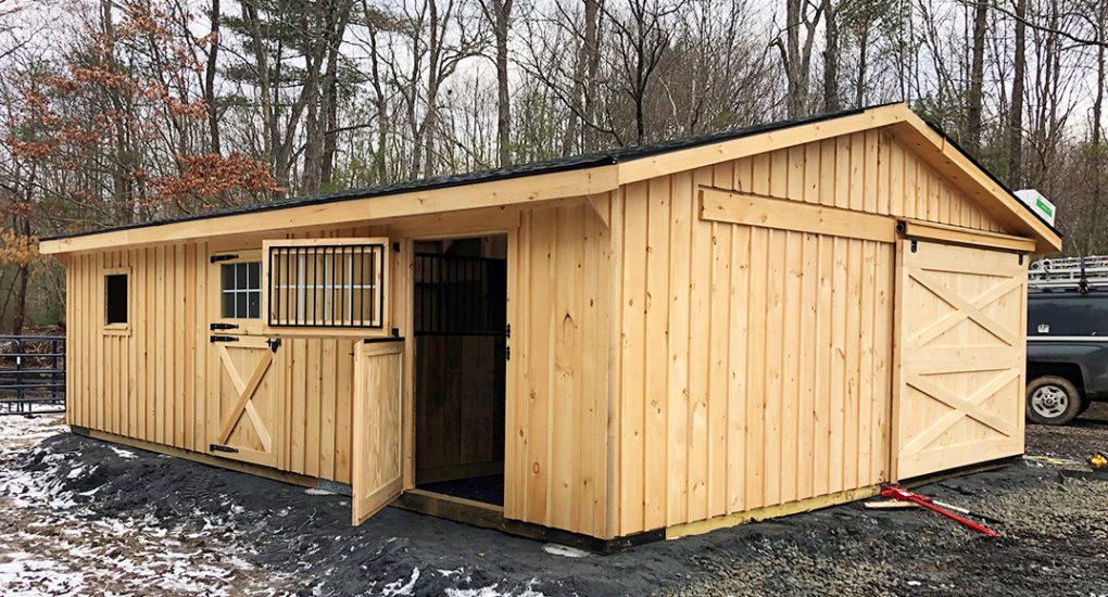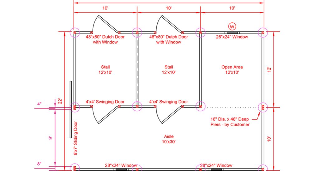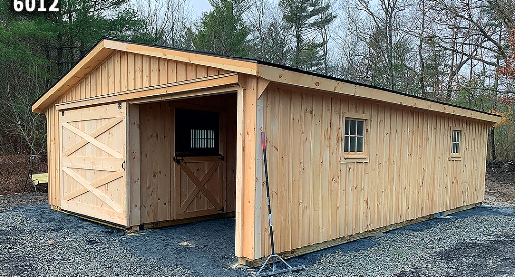 22×30 Double-Wide barn includes (2) 12×10 stalls, 12×10 storage room, 10′ aisle, ridge vent
