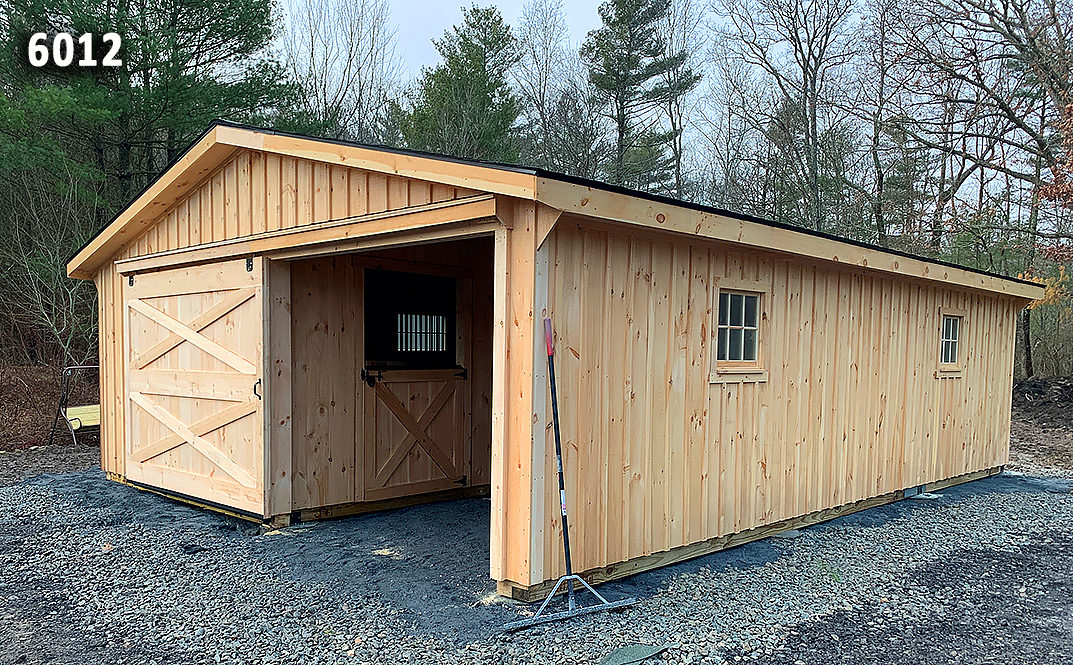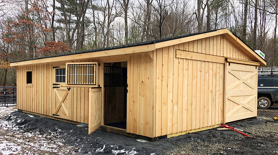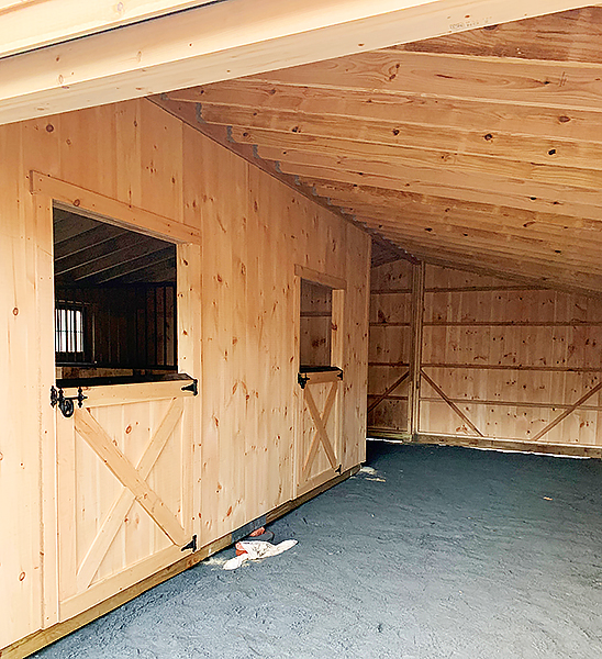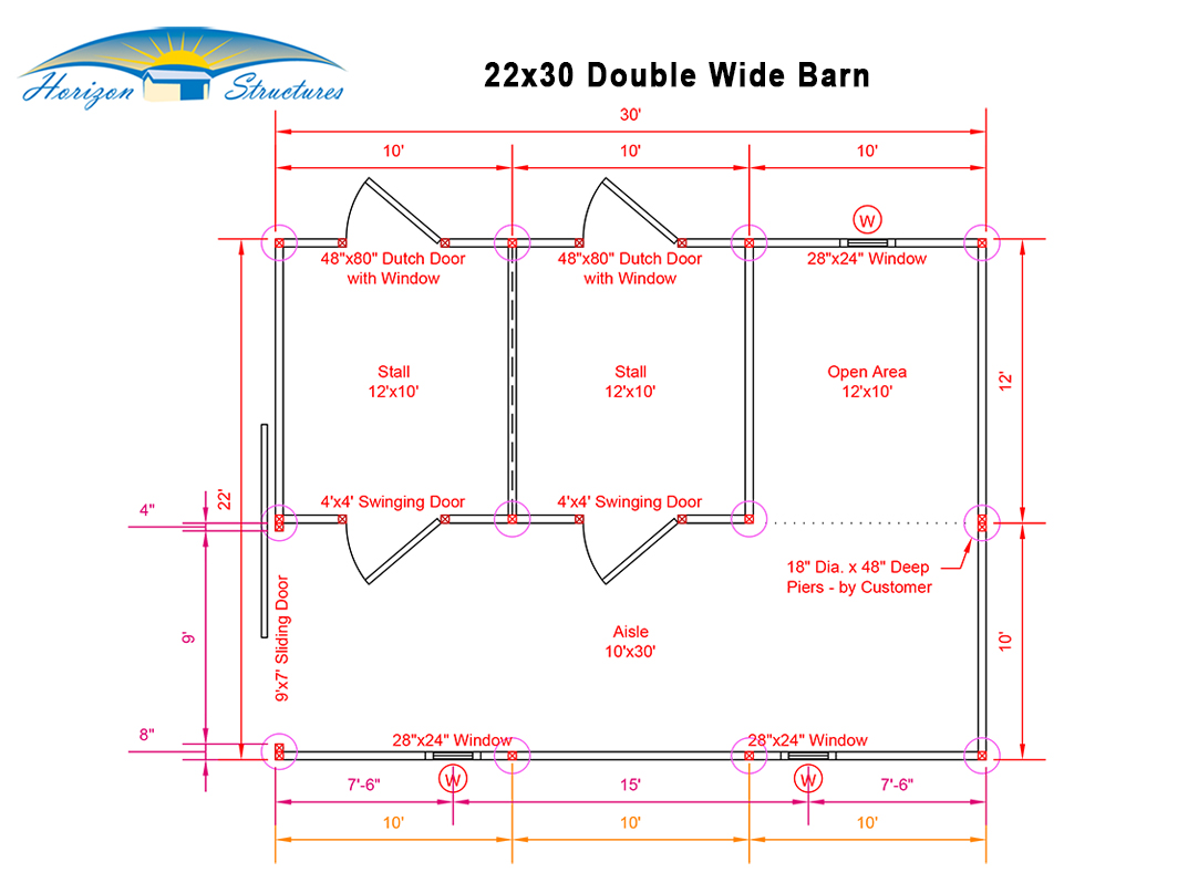 22×30 Double-Wide barn includes (2) 12×10 stalls, 12×10 storage room, 10′ aisle, ridge vent