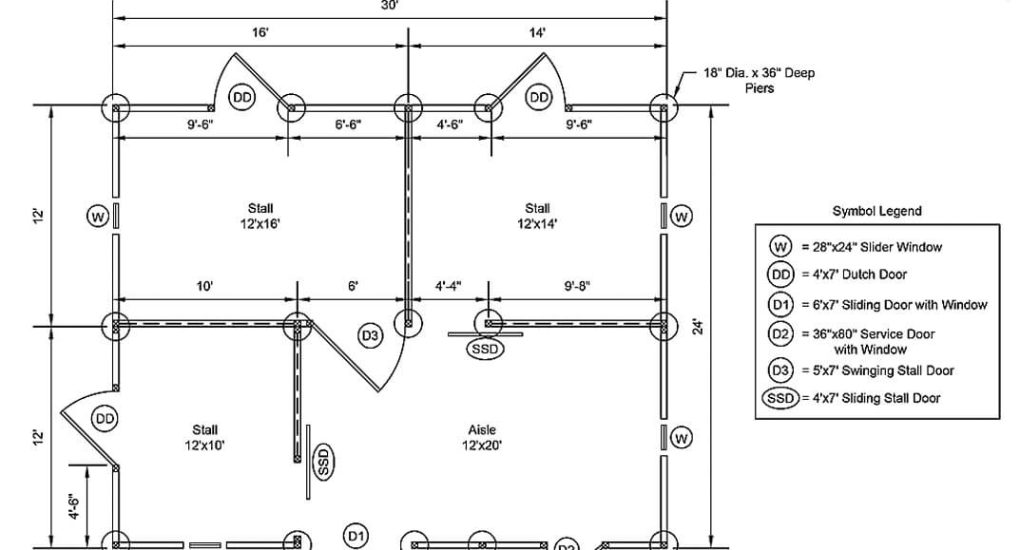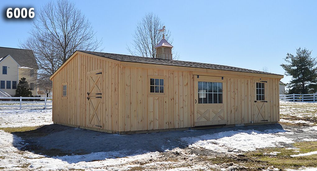 24×30 Double-Wide Barn. Includes: (2) 12×15 stalls, 10×12 stall, 20×12 aisle