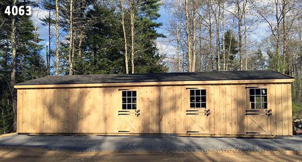 20×40 “Double Wide” Barn. Barn includes: (2) 10×8 stalls, 10×12 stall, 10×12 open (hay) storage area with wooden floor. 10×40 aisle
