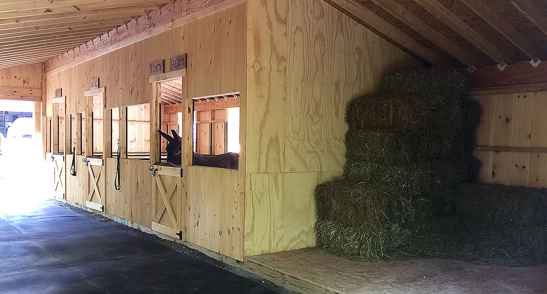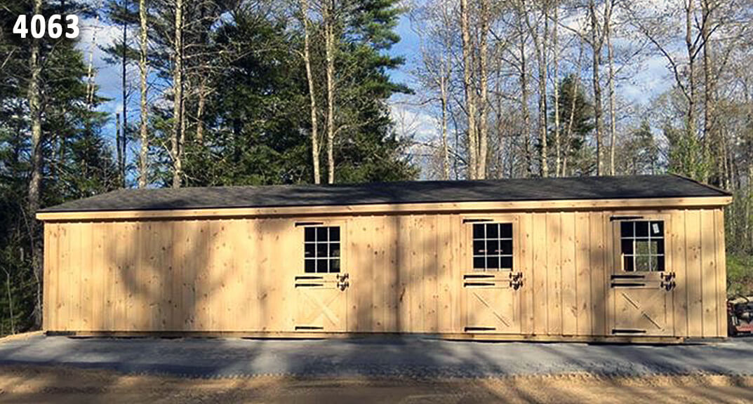 20×40 “Double Wide” Barn. Barn includes: (2) 10×8 stalls, 10×12 stall, 10×12 open (hay) storage area with wooden floor. 10×40 aisle