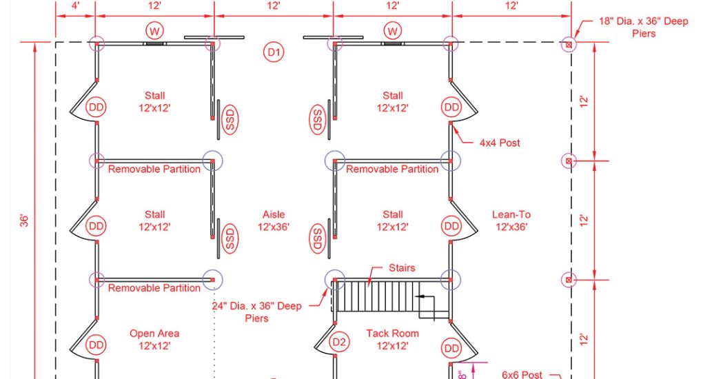36×36 High Profile barn includes (4) 12×12 stalls, 12×12 tack room, 12×12 open storage area, 12′ & 4′ overhang, metal roof, upgrade stall windows to Dutch doors with windows & grills, windows in aisle doors, copper roof cupola and weathervane and more…