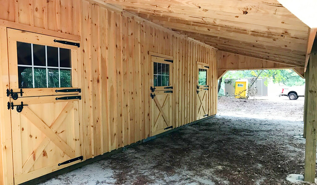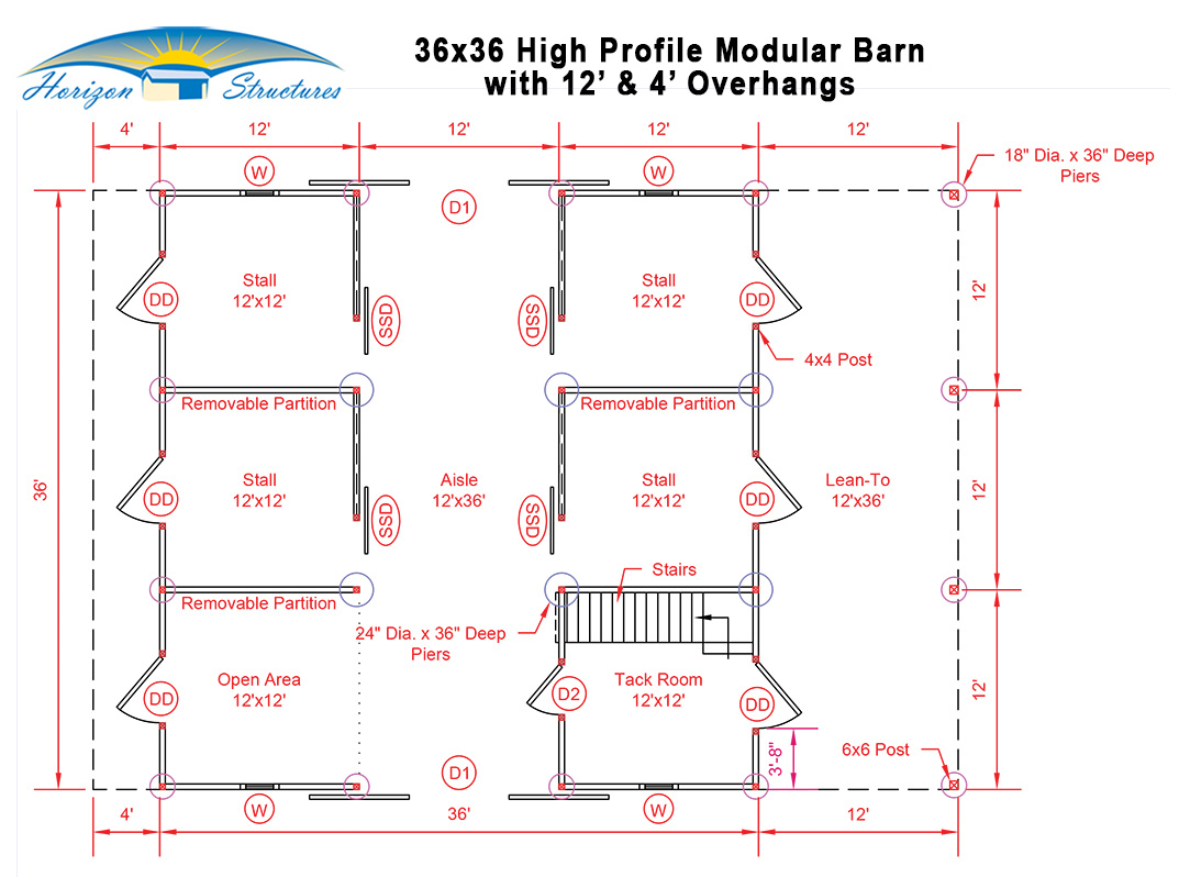 36×36 High Profile barn includes (4) 12×12 stalls, 12×12 tack room, 12×12 open storage area, 12′ & 4′ overhang, metal roof, upgrade stall windows to Dutch doors with windows & grills, windows in aisle doors, copper roof cupola and weathervane and more…
