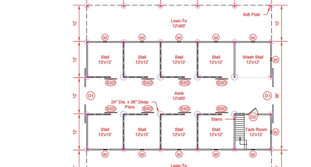 36×60 High Profile barn includes: (8) 12×10 stalls, 12×12 tack room, 12×12 open storage area, (2) 12′ overhangs, loft