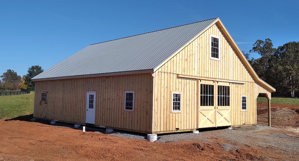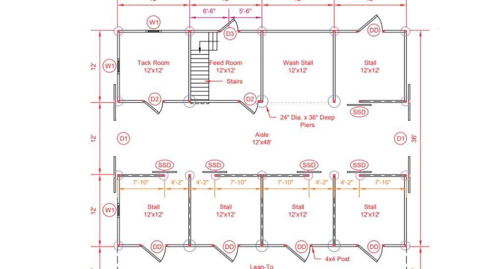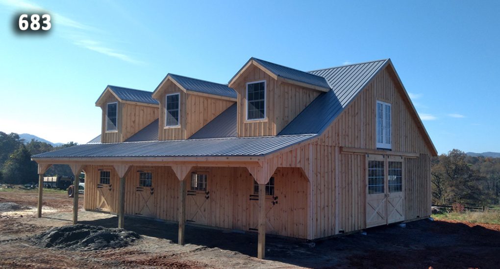 36×48 High Profile barn includes (5) 12×12 stalls, 12×12 tack room, 12×12 feed room, 12×12 wash stall, windows in aisle doors, stall windows upgraded to Dutch doors with windows and grills, dormers, 8′ overhang, metal roof and more…