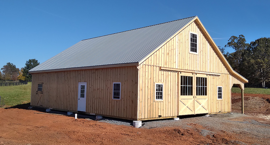 36×48 High Profile barn includes (5) 12×12 stalls, 12×12 tack room, 12×12 feed room, 12×12 wash stall, windows in aisle doors, stall windows upgraded to Dutch doors with windows and grills, dormers, 8′ overhang, metal roof and more…