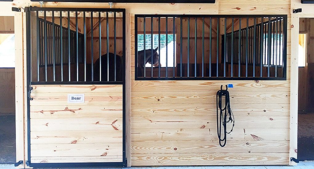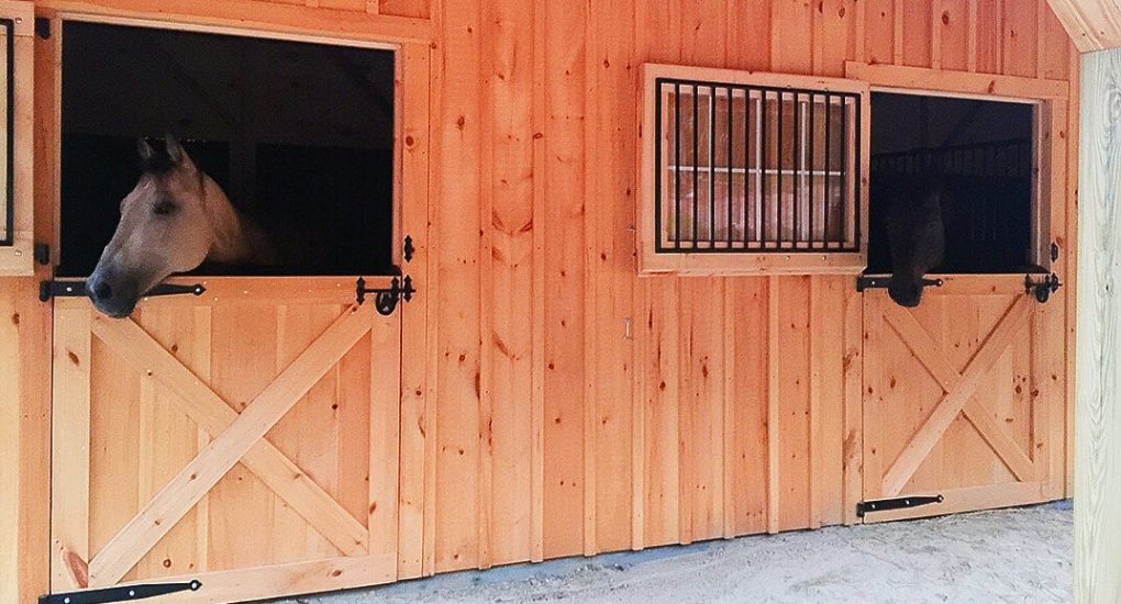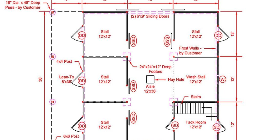 36×36 High Profile Modular barn includes: (4) 12×12 stalls, 12×12 tack/feed room, 12×12 wash stall, 12′ center aisle, loft