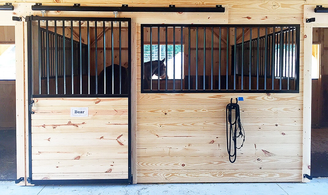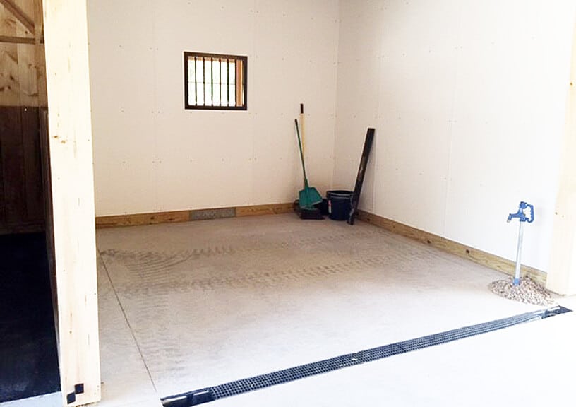 36×36 High Profile Modular barn includes: (4) 12×12 stalls, 12×12 tack/feed room, 12×12 wash stall, 12′ center aisle, loft