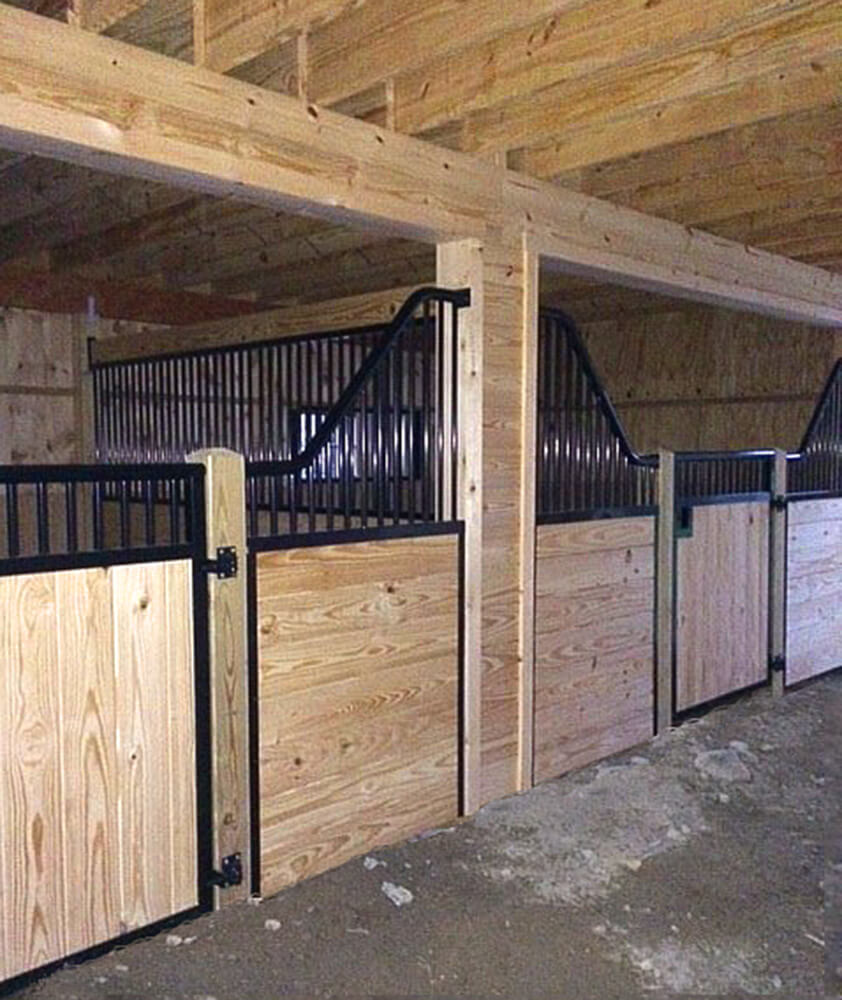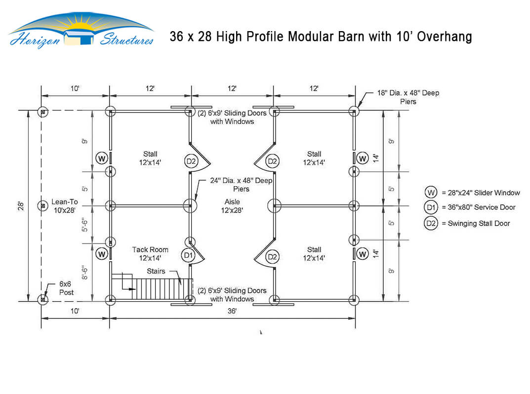 36×28 High Profile Barn includes metal roof with 10′ overhang, (2) 12×14 stalls with (customer supplied) custom Euro stall fronts and partitions, 12×14 tack/feed room, loft