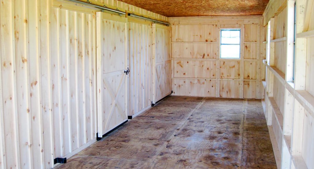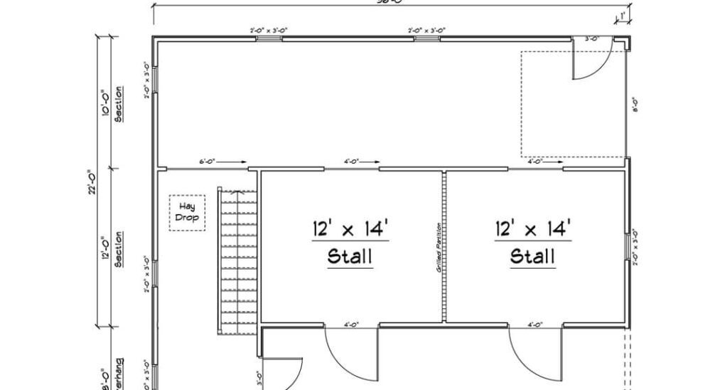 36×22 High Profile Barn includes (2) 12×14 stalls and partially enclosed 8′ overhang