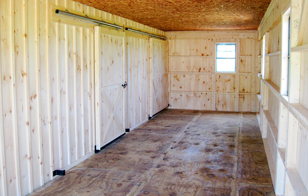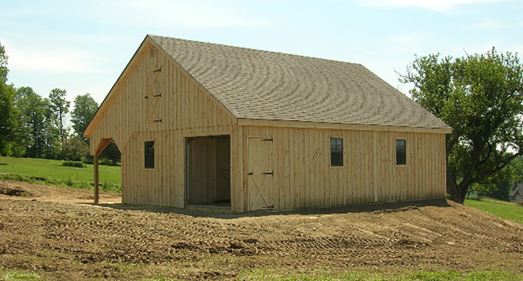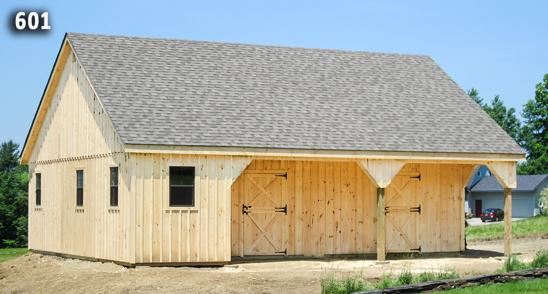 36×22 High Profile Barn includes (2) 12×14 stalls and partially enclosed 8′ overhang