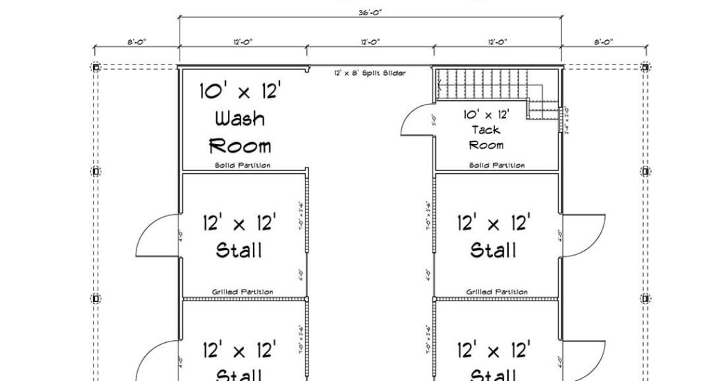 36×34 High Profile barn includes (4) 12×12 stalls, 10×12 tack room, 10×12 wash stall, (2) 10′ overhangs