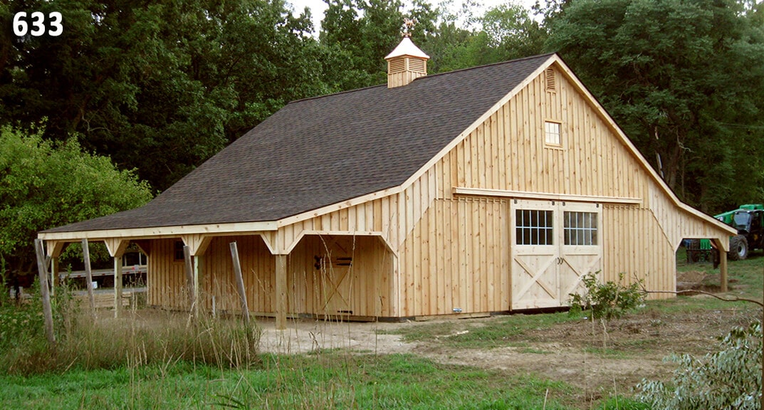 36×34 High Profile barn includes (4) 12×12 stalls, 10×12 tack room, 10×12 wash stall, (2) 10′ overhangs