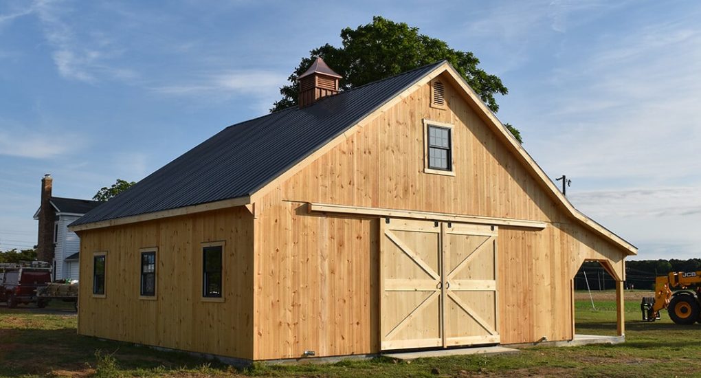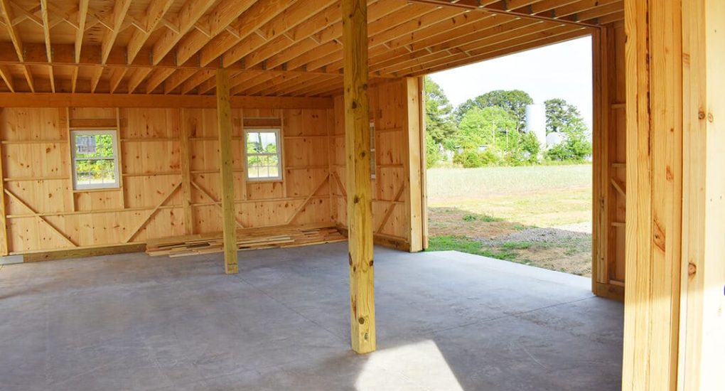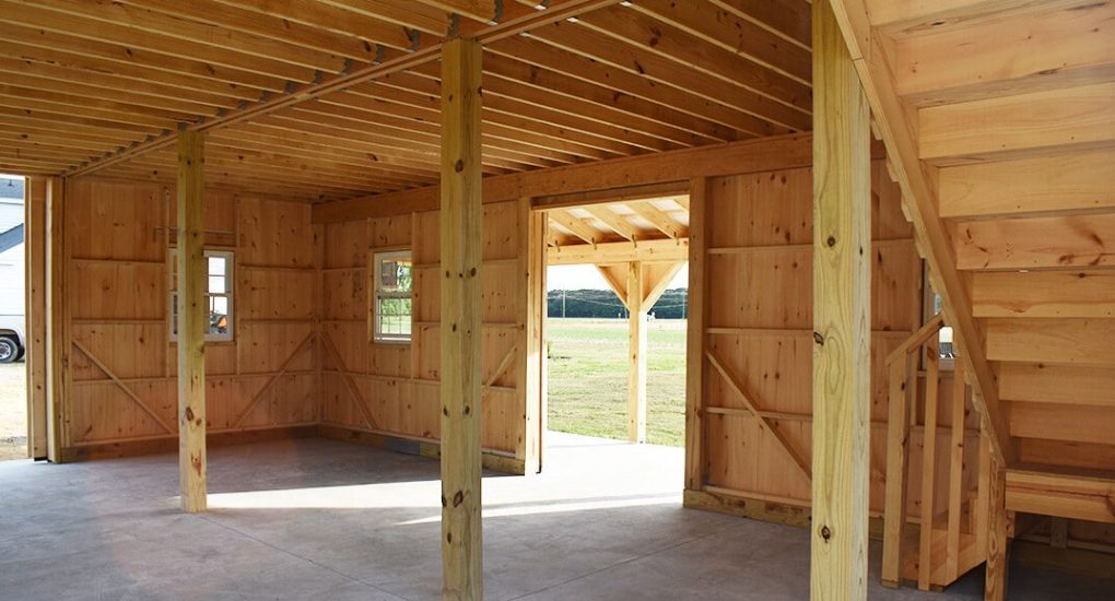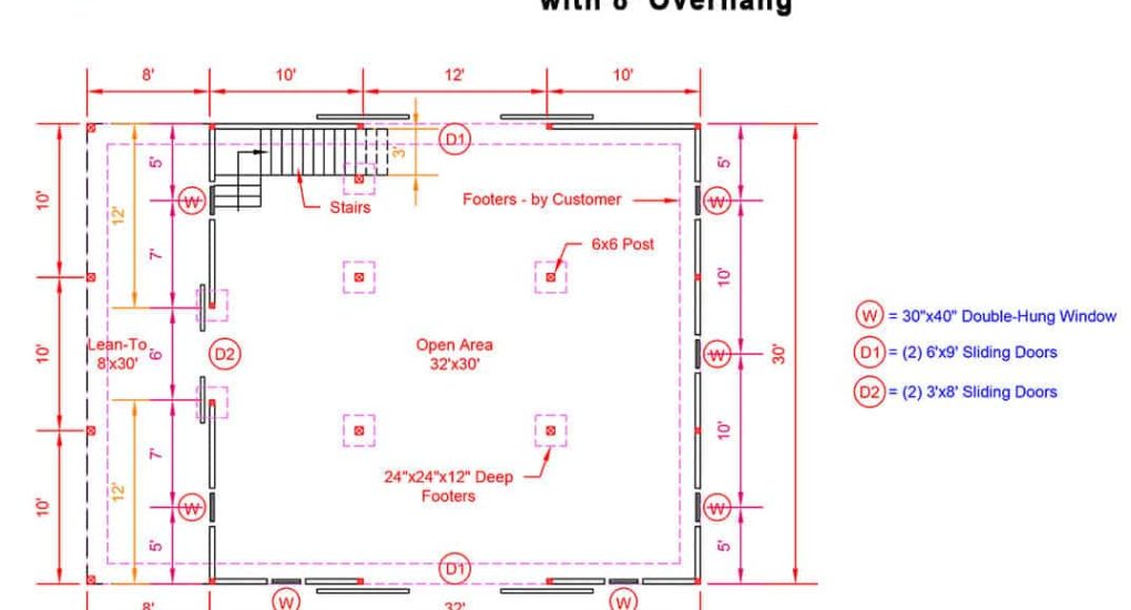 32×30 High Profile barn with 8′ overhang – open floor plan. Includes: metal roof