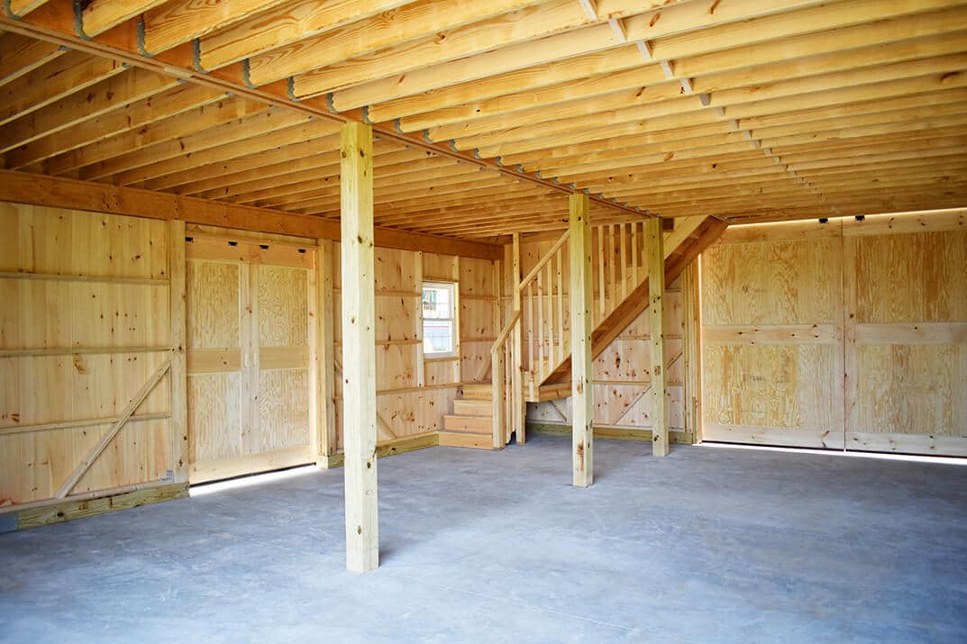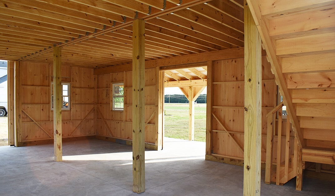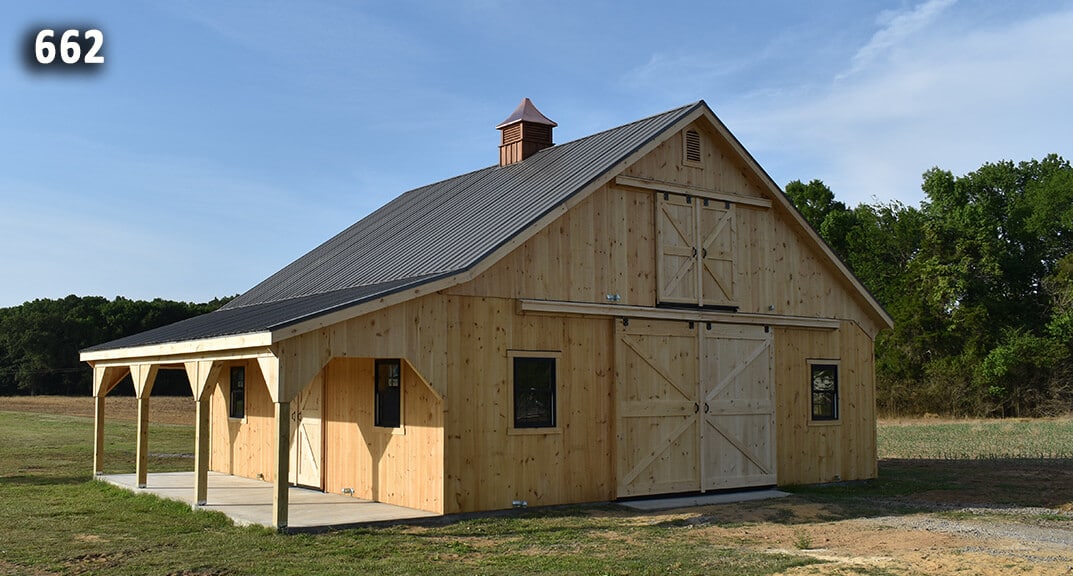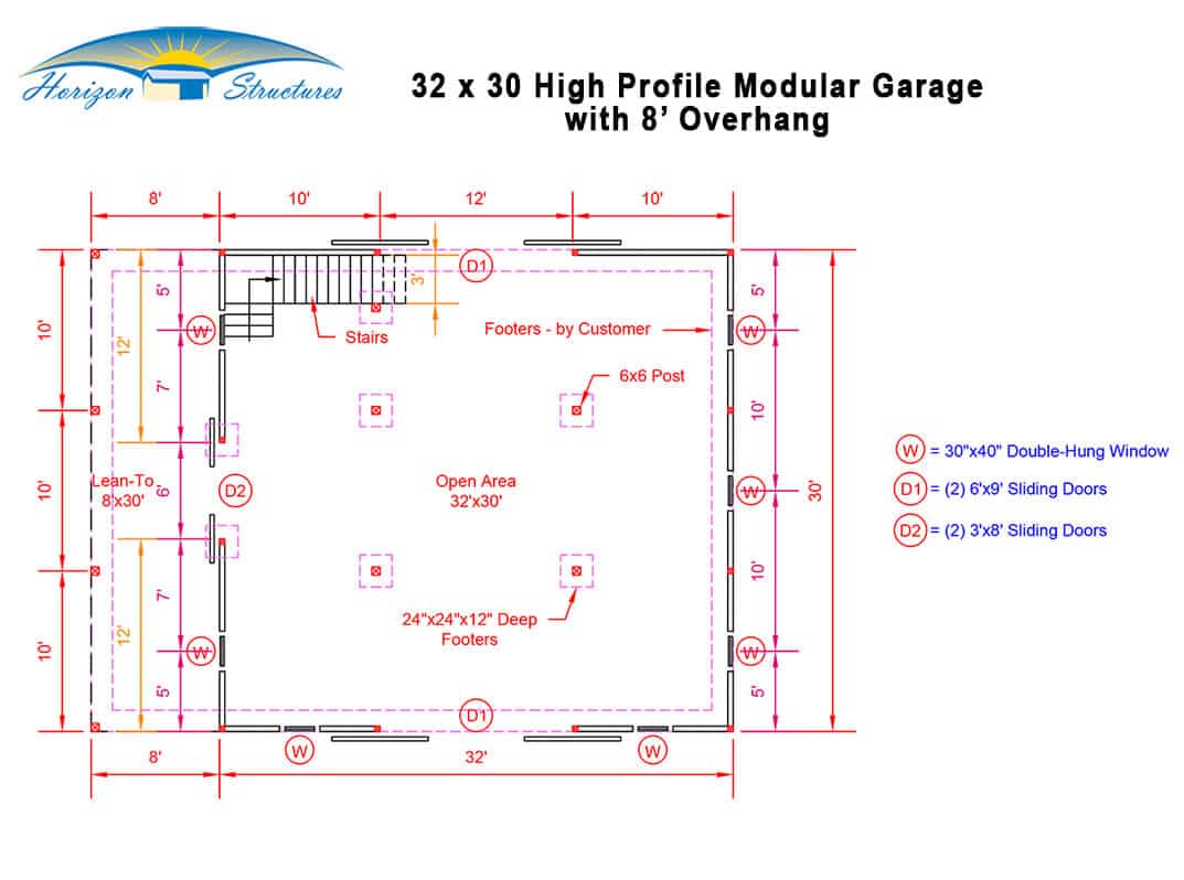 32×30 High Profile barn with 8′ overhang – open floor plan. Includes: metal roof