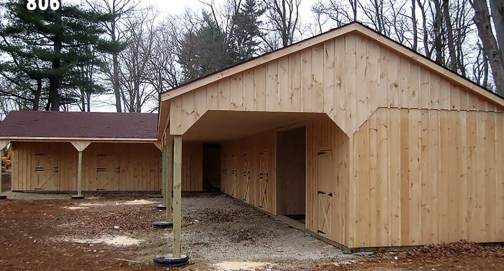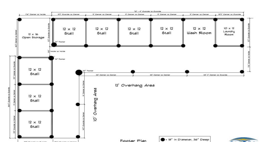 12×106 L-Shaped Horse Barn includes (7) 10×10 stalls, 12×12 wash stall, 10×12 laundry area, 12′ Overhang (70′ ‘front’) and 10′ Overhang (40′ ‘side’), 12×16 ‘open storage’ area in “L’ connector space