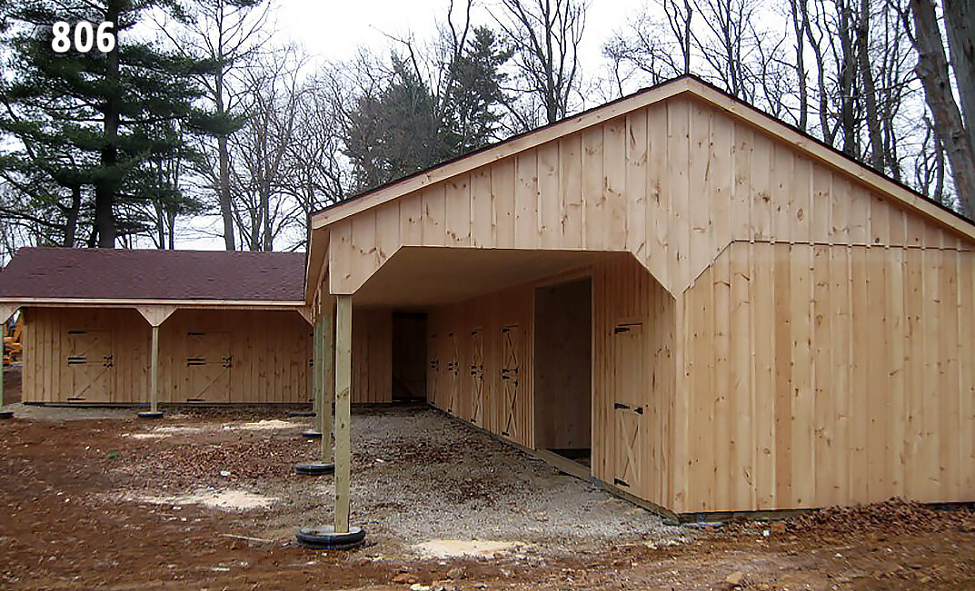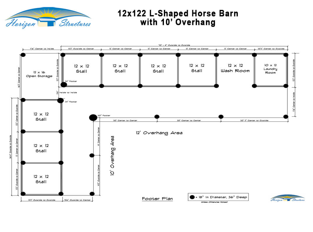 12×106 L-Shaped Horse Barn includes (7) 10×10 stalls, 12×12 wash stall, 10×12 laundry area, 12′ Overhang (70′ ‘front’) and 10′ Overhang (40′ ‘side’), 12×16 ‘open storage’ area in “L’ connector space
