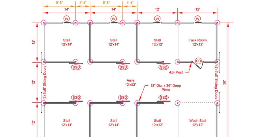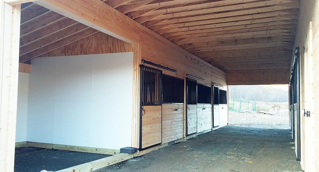 36×52 Low Profile barn includes (2) 12×12 stalls, (4) 12×14 stalls, 12×12 tack room, 12×12 wash stall