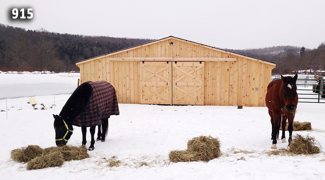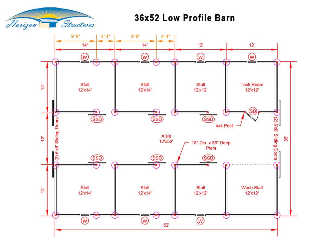 36×52 Low Profile barn includes (2) 12×12 stalls, (4) 12×14 stalls, 12×12 tack room, 12×12 wash stall
