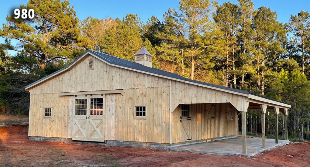 36×36 Low Profile includes (2) 12×12 stalls, (2) 12×14 stalls, 12×10 tack room, 12×10 feed room, 12′ overhang, metal roof, upgrade stall windows to Dutch doors, windows in aisle doors, copper roof cupola and weathervane and more…