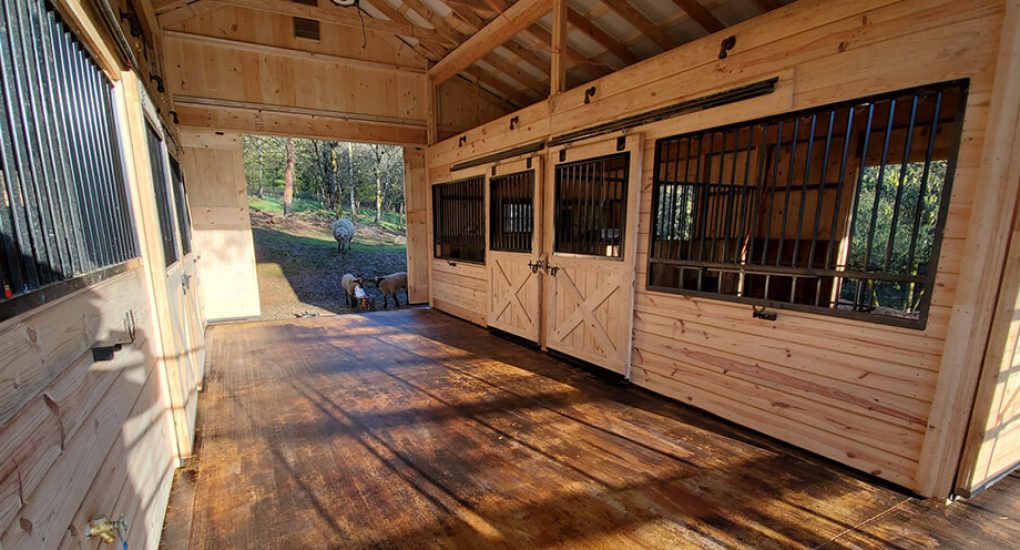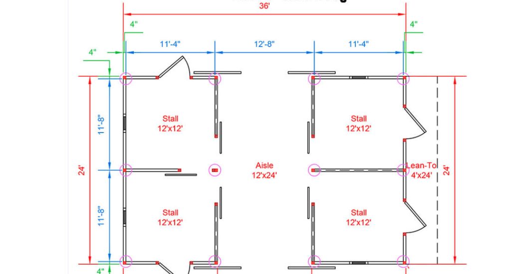 36×24 Low Profile includes (4) 12×12 stalls, 12′ raised center aisle, 4′ overhang, metal roof, windows in Dutch doors, gable vents, ridge vent, copper roofed cupola and weathervane, custom grill stall fronts with feed-thru bottom