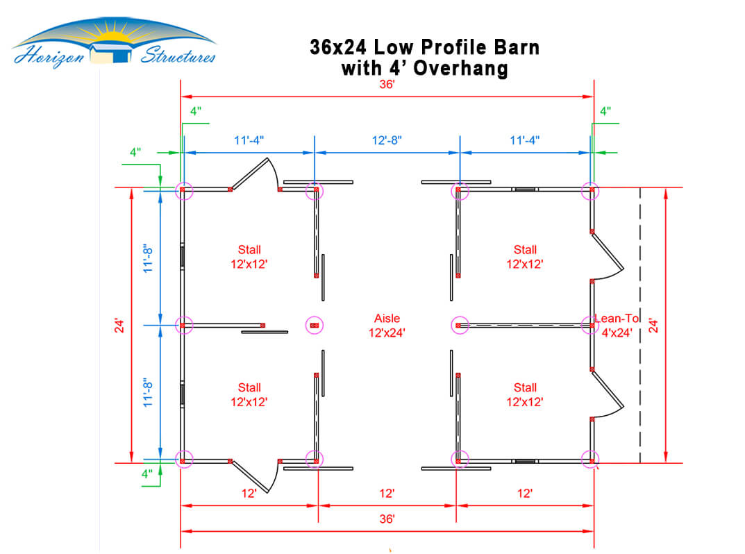 36×24 Low Profile includes (4) 12×12 stalls, 12′ raised center aisle, 4′ overhang, metal roof, windows in Dutch doors, gable vents, ridge vent, copper roofed cupola and weathervane, custom grill stall fronts with feed-thru bottom