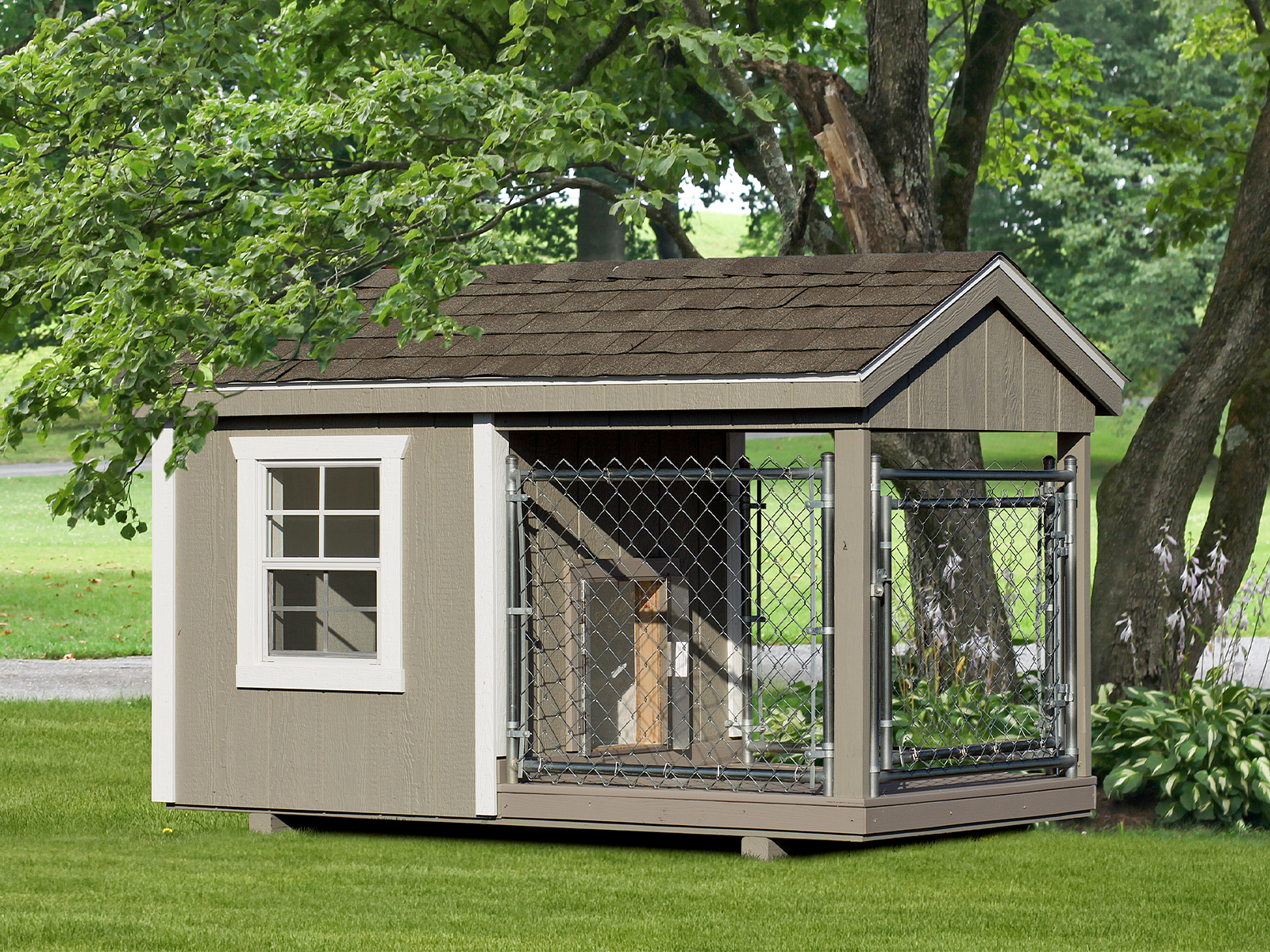 This kennel is durable enough to handle virtually any weather condition, easy to clean and comes backed with our commitment to quality craftsmanship. In addition to providing your pooch with a safe place to live, this kennel features a timeless style with light grey paint, white trim, and weathered wood shingles that are sure to match any home’s aesthetic. Additional siding, roofing, and color choices available.